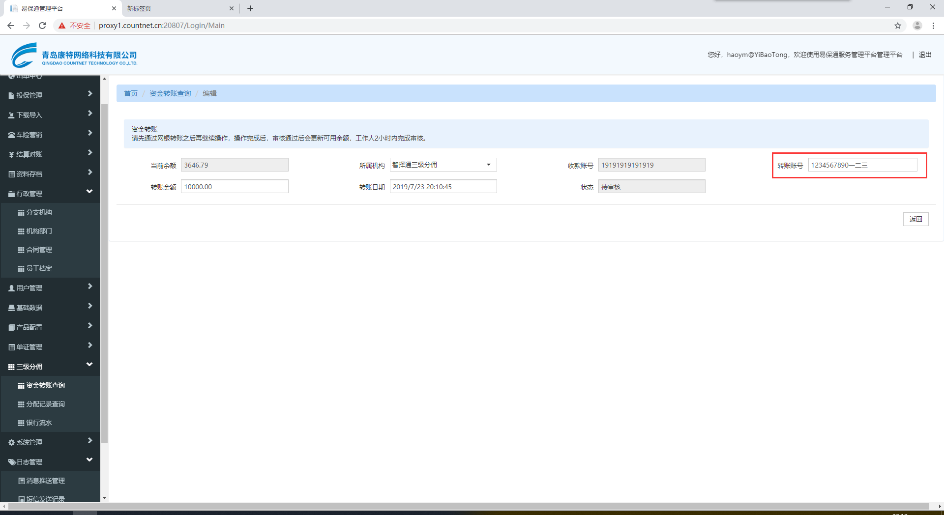 【佣金代付】资金转账查询,转账账号可输入数字以外字符,并能保存提交成功
