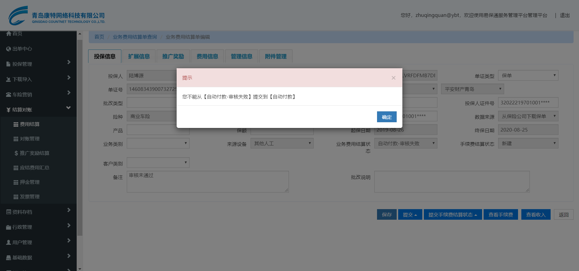 3、业务员在结算单中再次提交结算单状态为自动付款