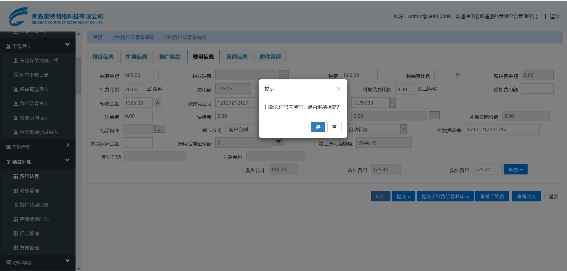 结果:提示‘付费凭证号未填写是否继续提交’。