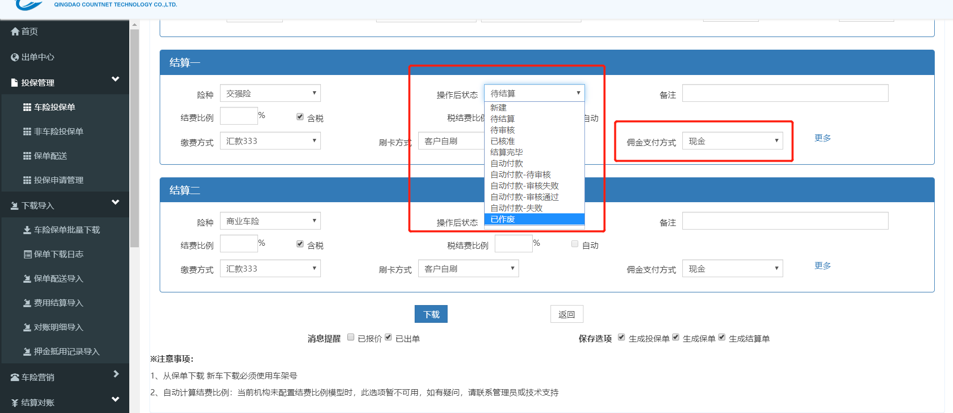 【佣金代付】费用结算,从保险公司下载保单时,佣金支付方式不是自动转账时,操作后的状态选项也有自动付款、自动付款-待审核、自动付款-审核通过、自动付款-审核失败、自动付款-失败等状态。