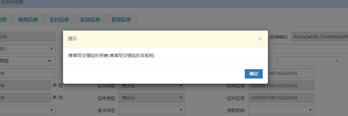 【出单中心2.0】选择已报价的投保单,“去报价"时选择新建,提示必须填写交强险的保费和车船税,见图