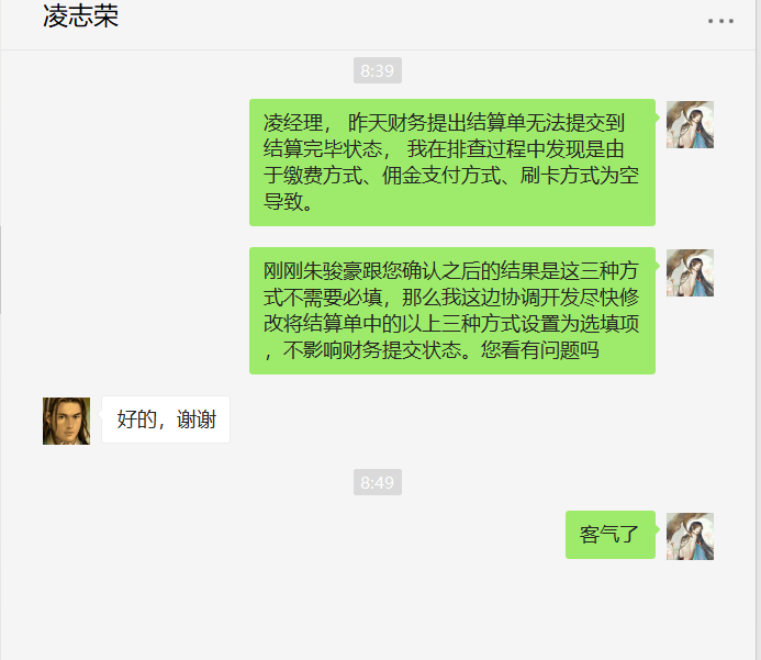 描述:生成结算单或提交结算单状态在“结算完毕”之前佣金支付方式、缴费方式、刷卡方式都未要求必填,提交至结算完毕却提示方式必填,现需修改结算单内的佣金支付方式、缴费方式、刷卡方式为选填项
