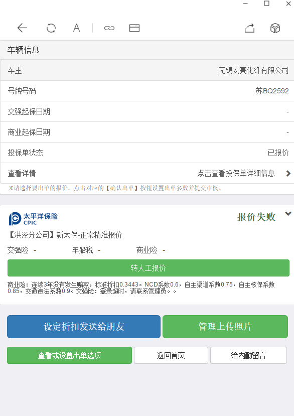 描述:上述车在以上投保单内提交到已报价,系统提示是否需要从保险公司下载投保单点击【是】,投保单数据下载成功后点击微信端的已报价提醒,系统显示报价失败,且没有报废。请开发排查。