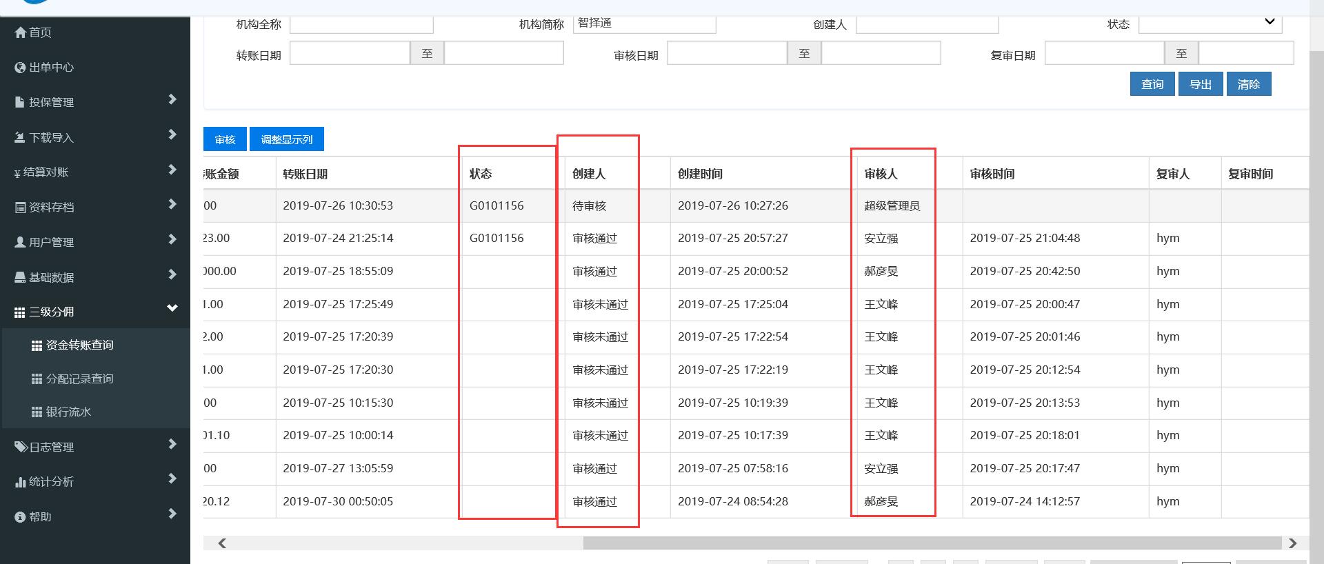 【佣金代付】资金转账查询,资金转账查询后列表显示错误,列名和内容不对等。