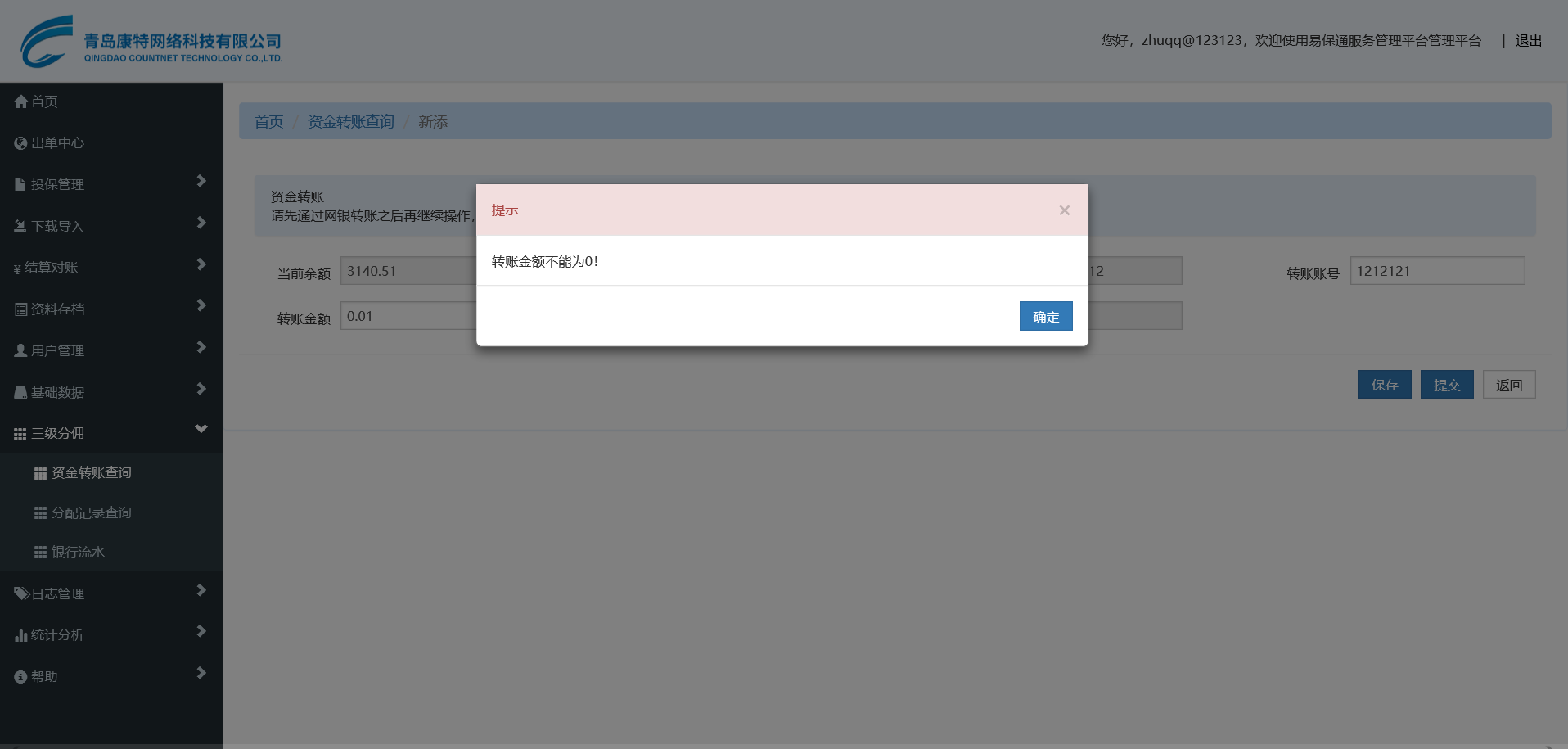 【佣金代付】资金转账查询,新建资金转账时转账金额填写小数(如0.01),提交时提示‘转账金额不能为0!’。