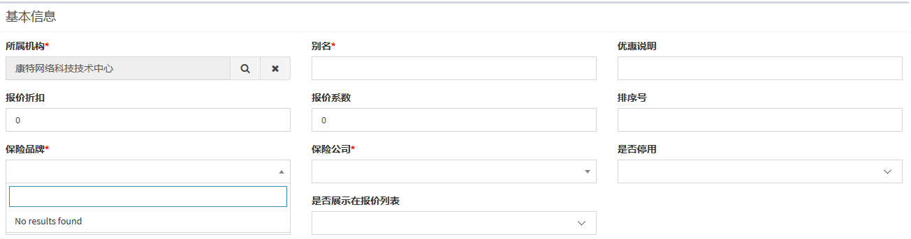 2、选择保险品牌后,选择保险公司为空,保险公司为必填项可以保存,保存后再次进入可以选择保险公司。