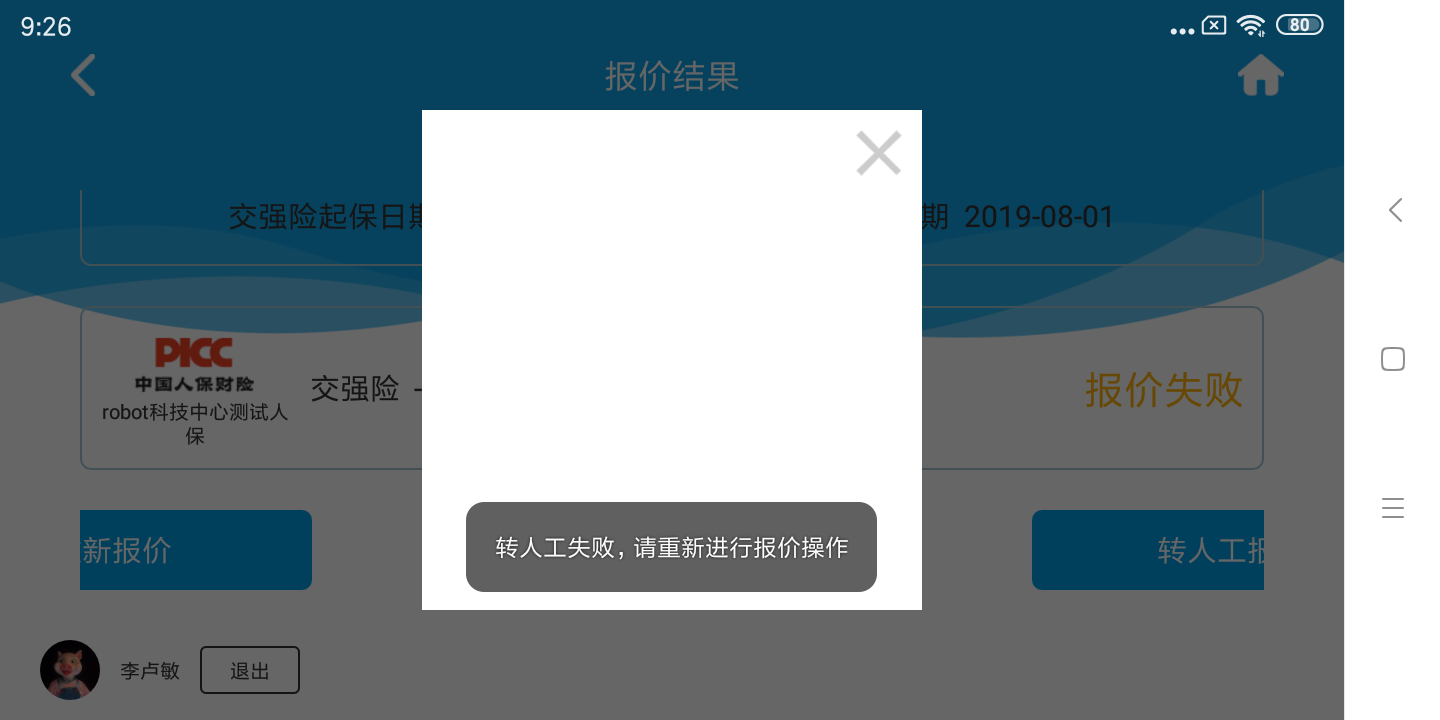 车险投保,报价结果界面,点击转人工提示转人工失败,请重新进行报价操作