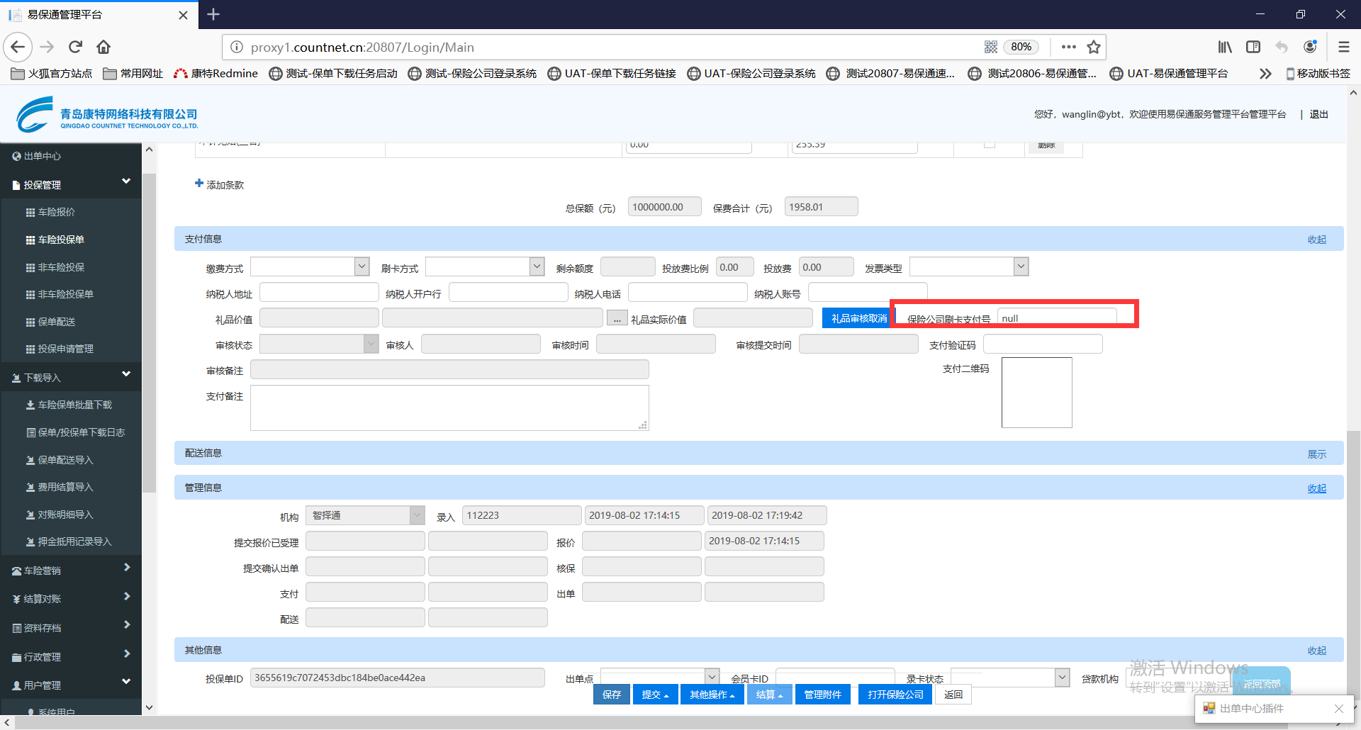 此时直接去便捷下载,下载到管理系统中后,该投保单的状态为“核保通过待支付”,查看支付信息,如图所示:刷卡支付号显示null,二维码位置显示空白框
