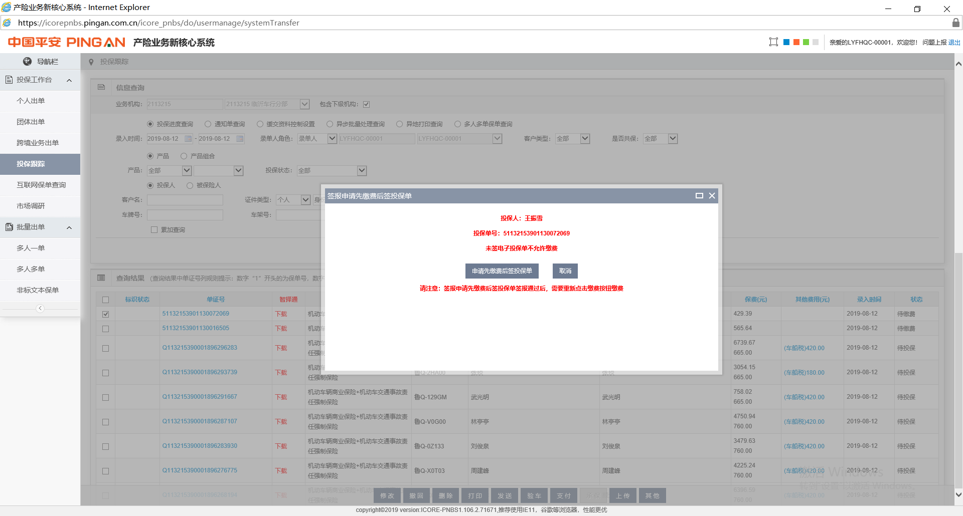 【出单中心2.0】去报价->在保险公司内报价成功后,直接申请核保并缴费,缴费时选择在线支付,在保险公司内只能到附图那一步