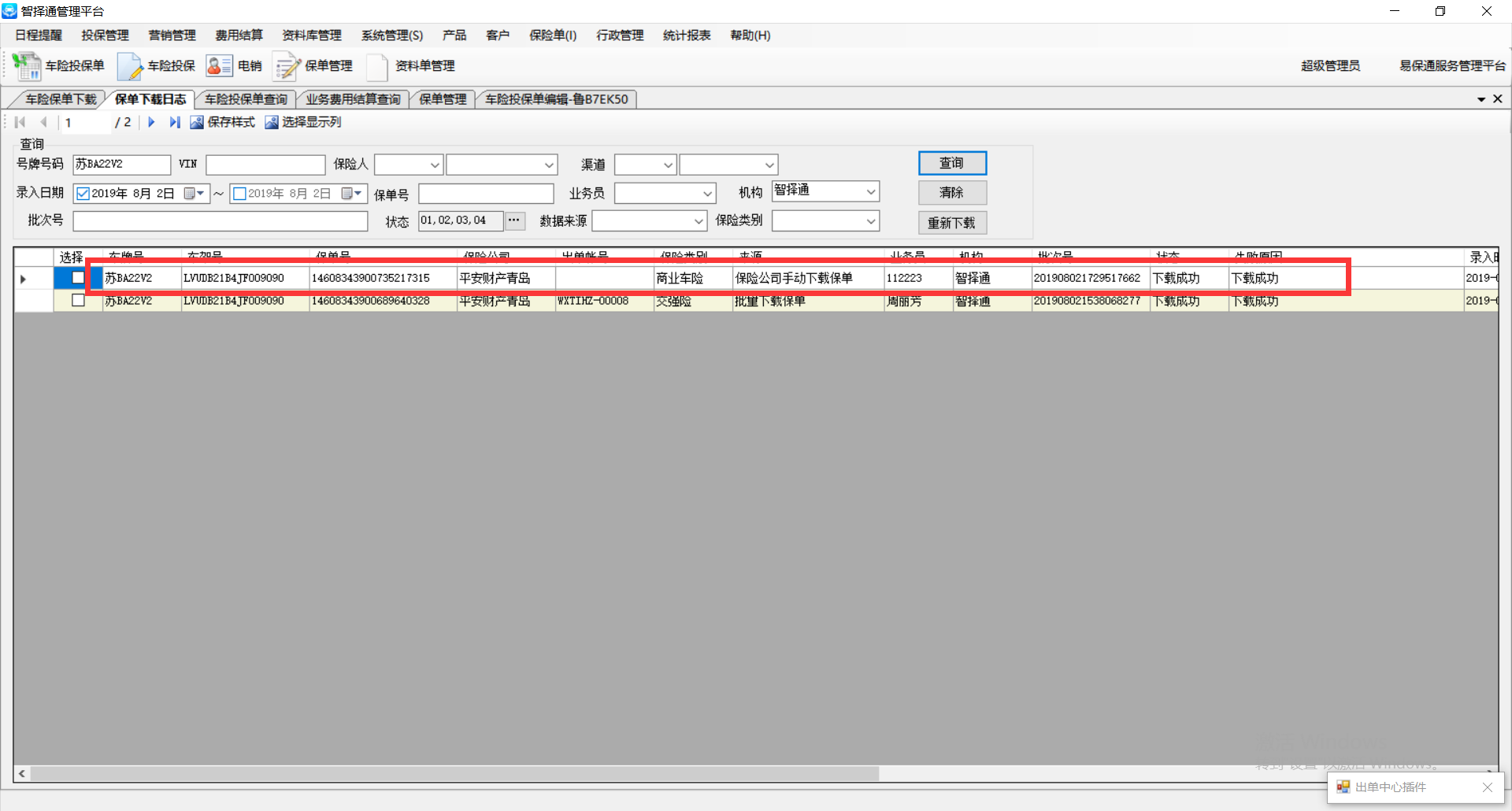 该车的交强在批量下载,让你后我去便捷下载了商业险保单,日志中显示下载成功,但是只能查到批量下载的交强,没有找到商业险保单,且没有出单账号,数据见图