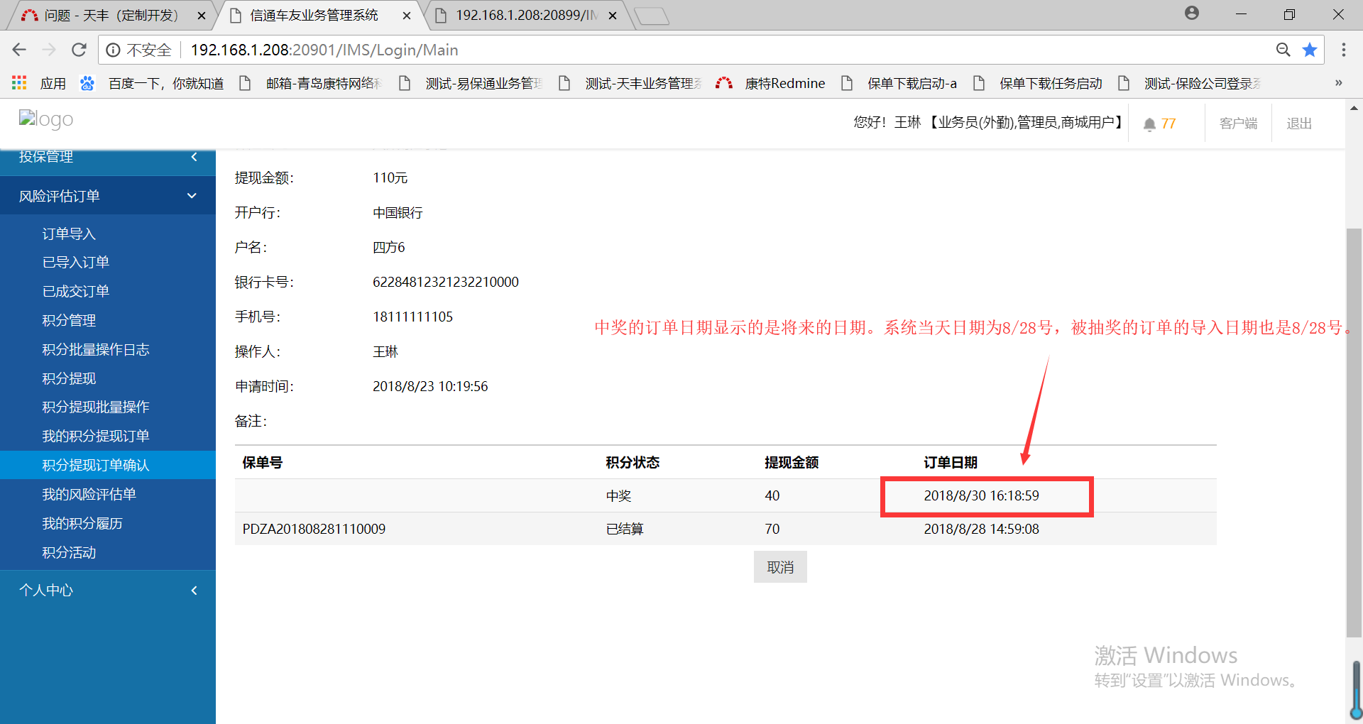 被抽奖的订单,导入时表格填写的是8/28号该订单被作为中奖提取后,明细中显示的订单日期为将来的日期(系统日期为8/28)见附图