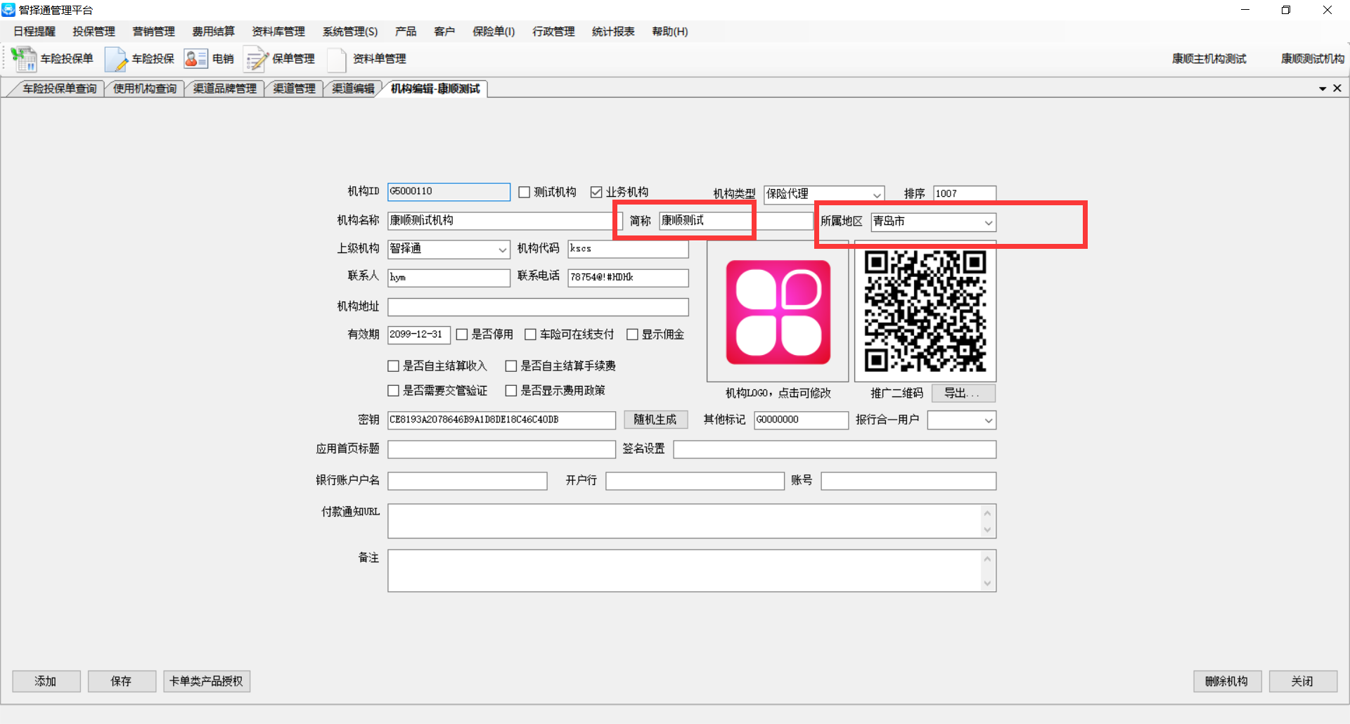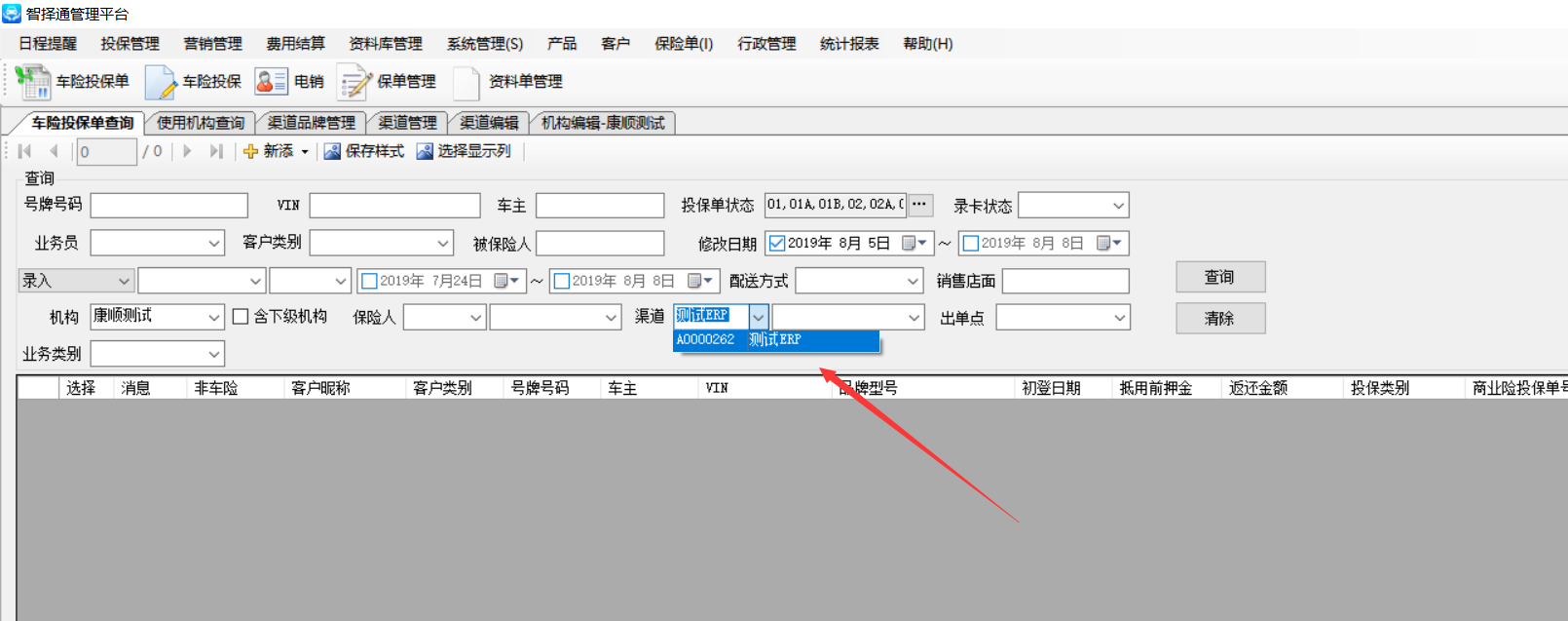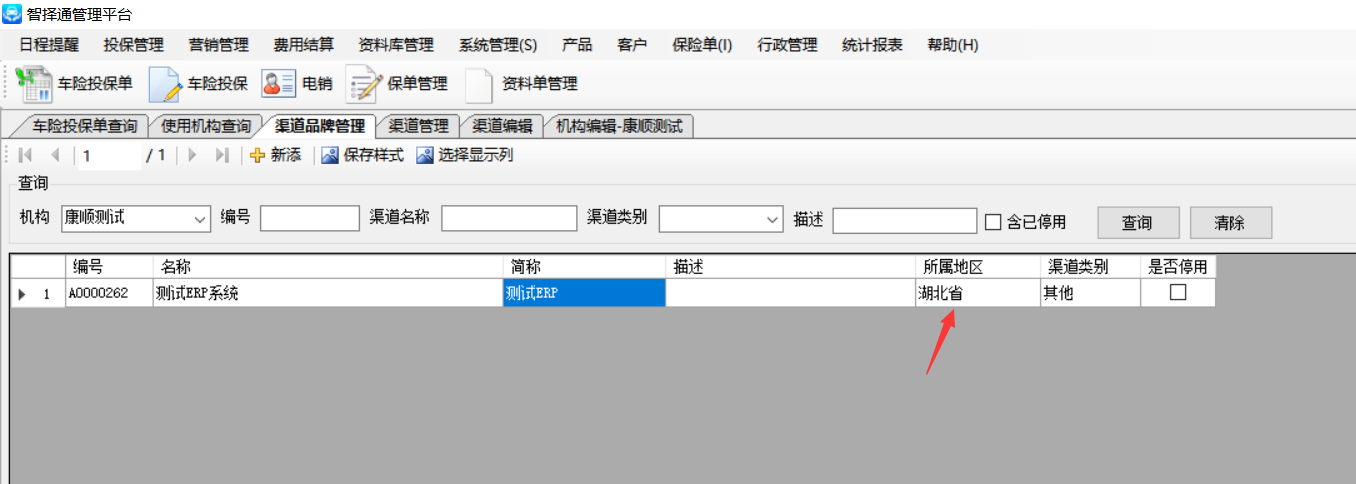 在车险投保单查询条件中,选择康顺测试机构,查看渠道品牌,显示了湖北地区的渠道品牌