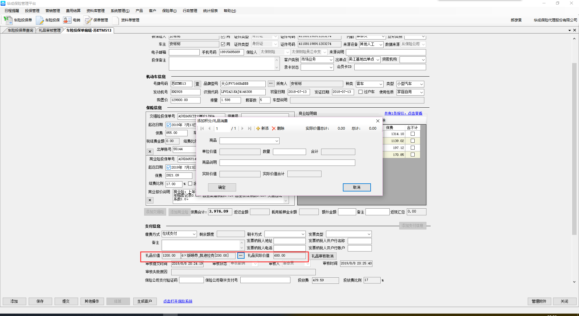 【华成】礼品价值审核,从礼品价值审核页面撤销已审核通过的礼品,对应投保单的礼品价值仍有该条显示,但礼品详情中没有