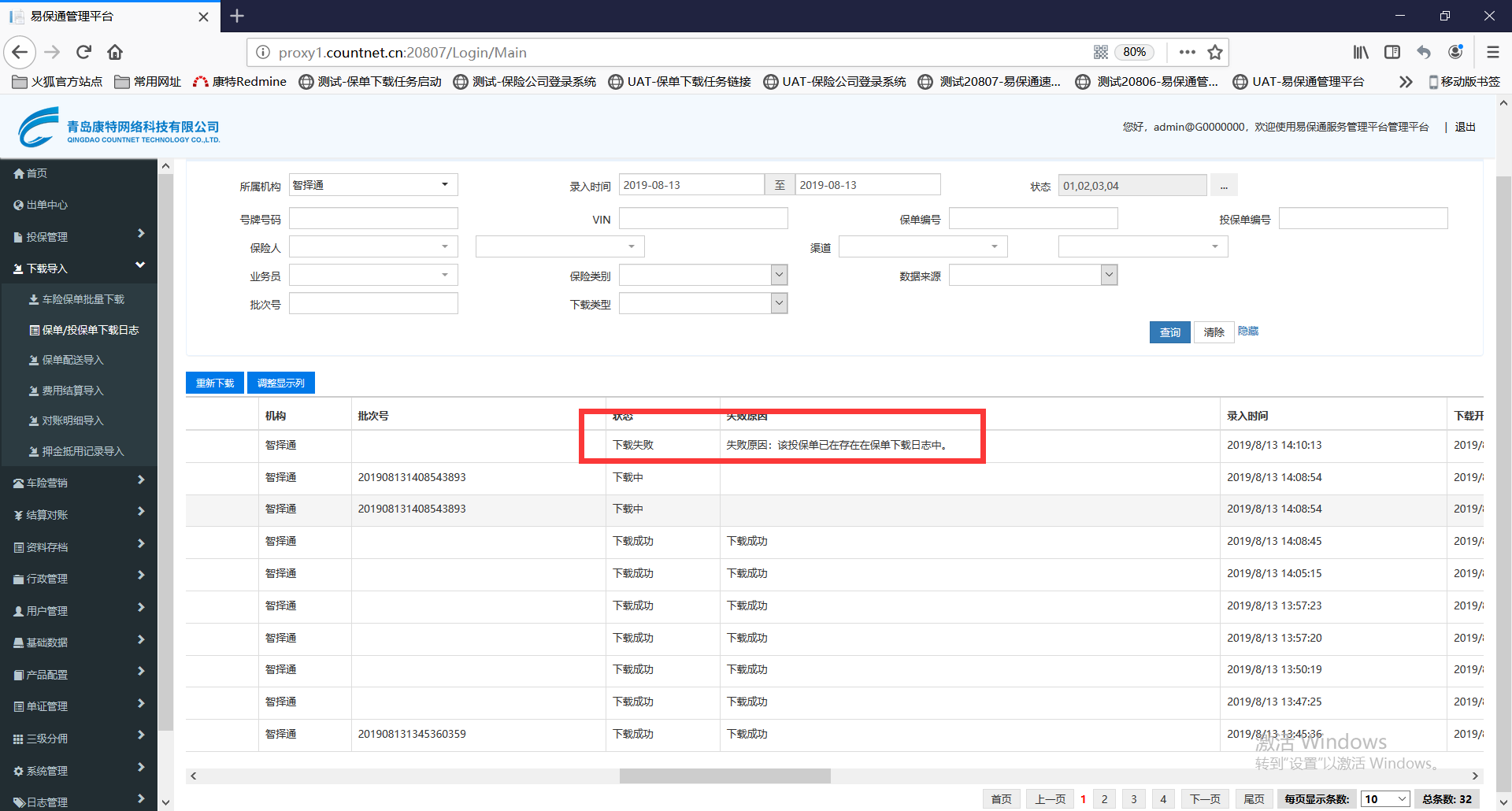 该问题是由于操作过快,第一次操作的生成的投保单下载日志还没有下载完成,第二次操作又生成了一条投保单下载日志,失败的日志重新下载即可