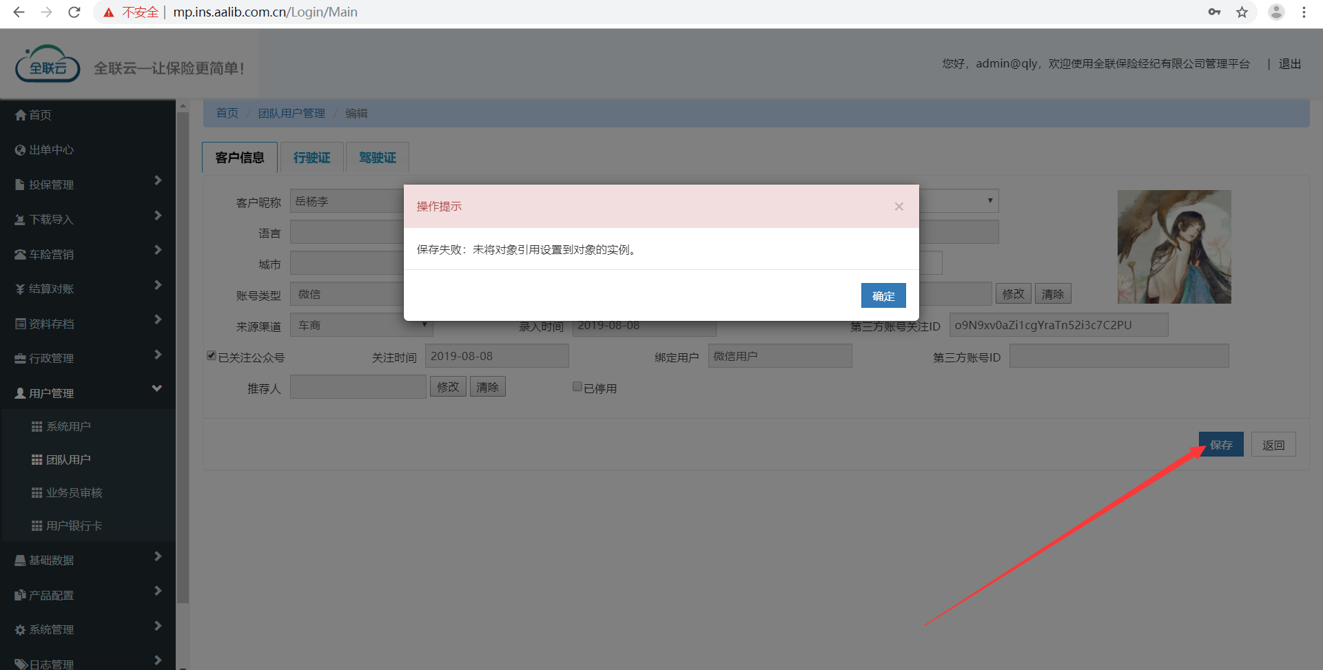 描述:团队用户——用户编辑页面,点击保存按钮系统提示“未将对象引入对象设置”