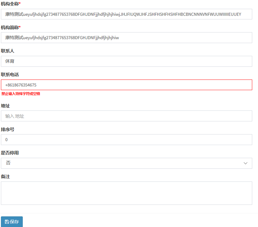 机构管理编辑联系电话,不能输入空格和+号。备注:用户管理联系人同样问题。