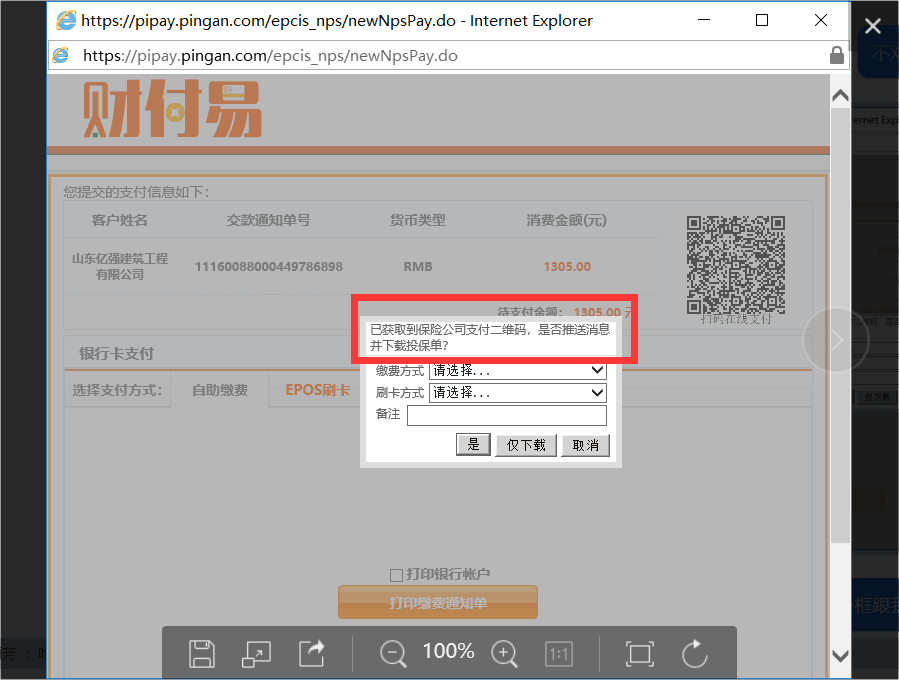 选择支付方式为刷卡,弹窗提示修改为【已获取到保险公司支付卡号,是否推送消息并下载投保单?】