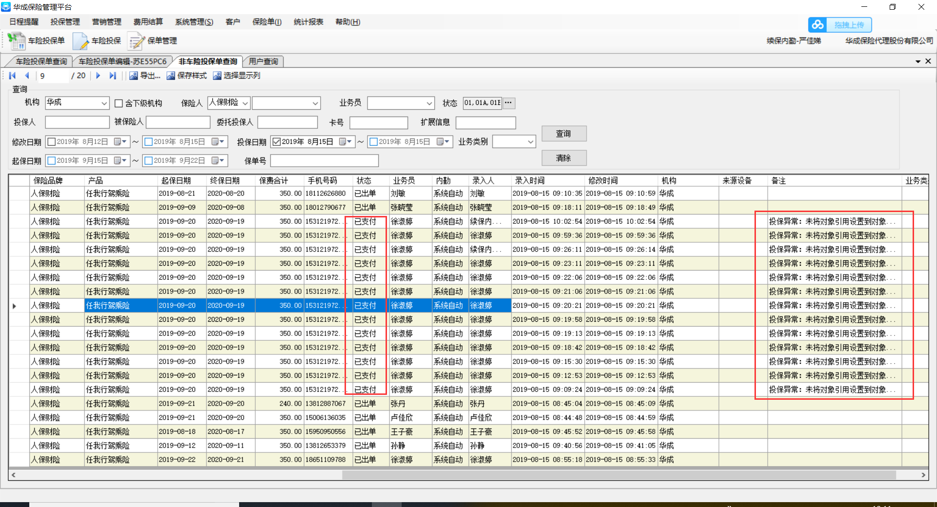 描述:上述车在投保单中投保人保驾乘险(70),选择起保日期为9.20号,最终提示投保失败“投保异常:未将对象引用设置到对象的实例。”;在非车险投保单中该车已存在多条已支付状态投保单,请开发排查这些该车共付款几次,且再保险公司是否已生成保单。