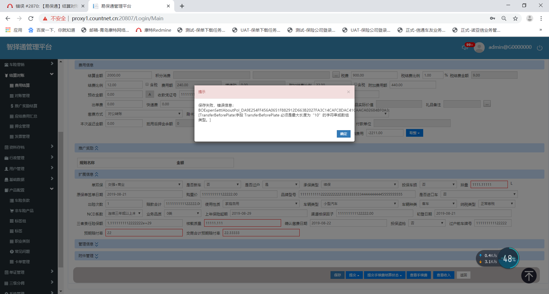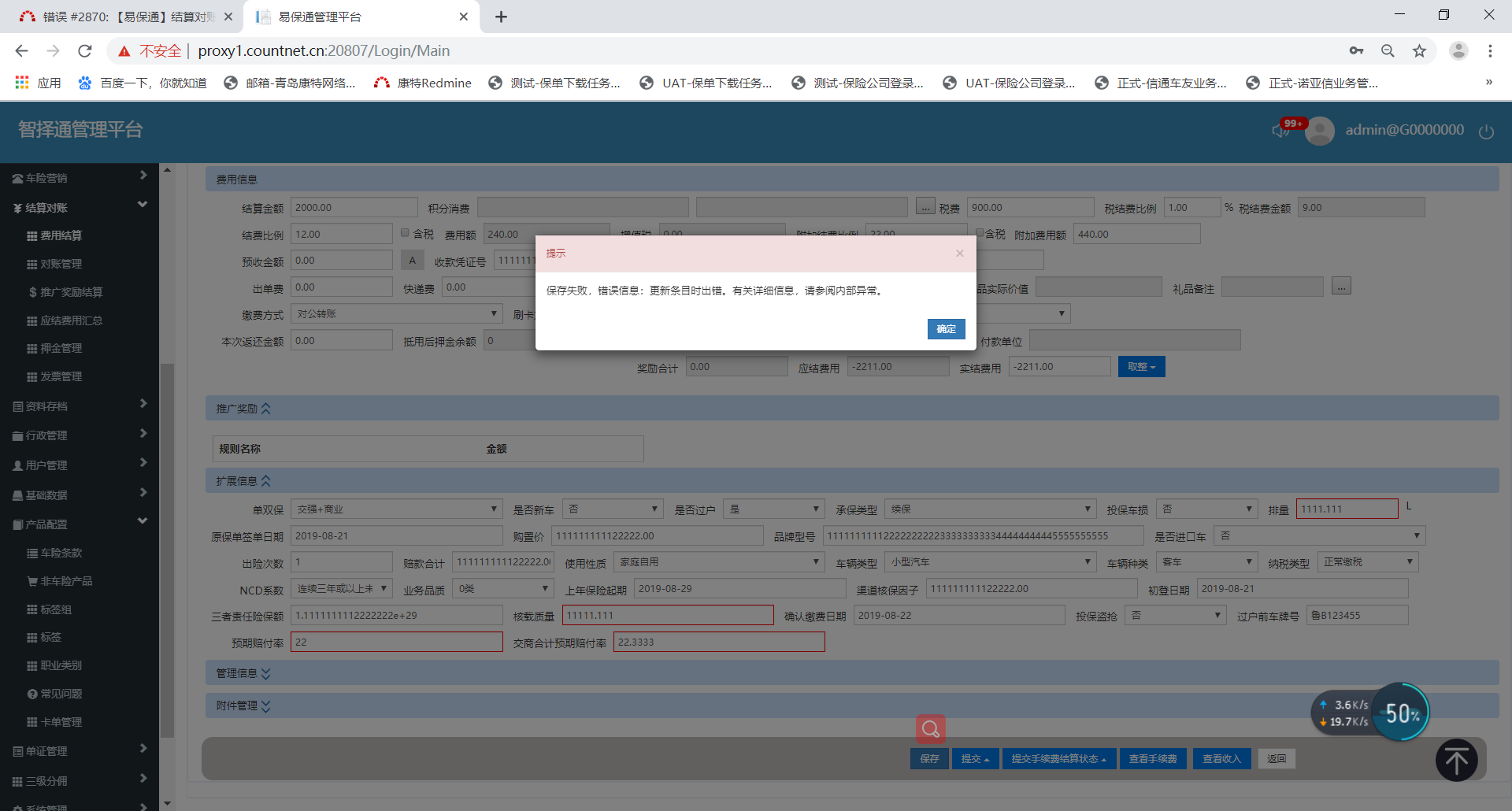 【费用结算】结算单编辑页面,保存时会报错,见附图,2次报错不同,请找出原因并修改
