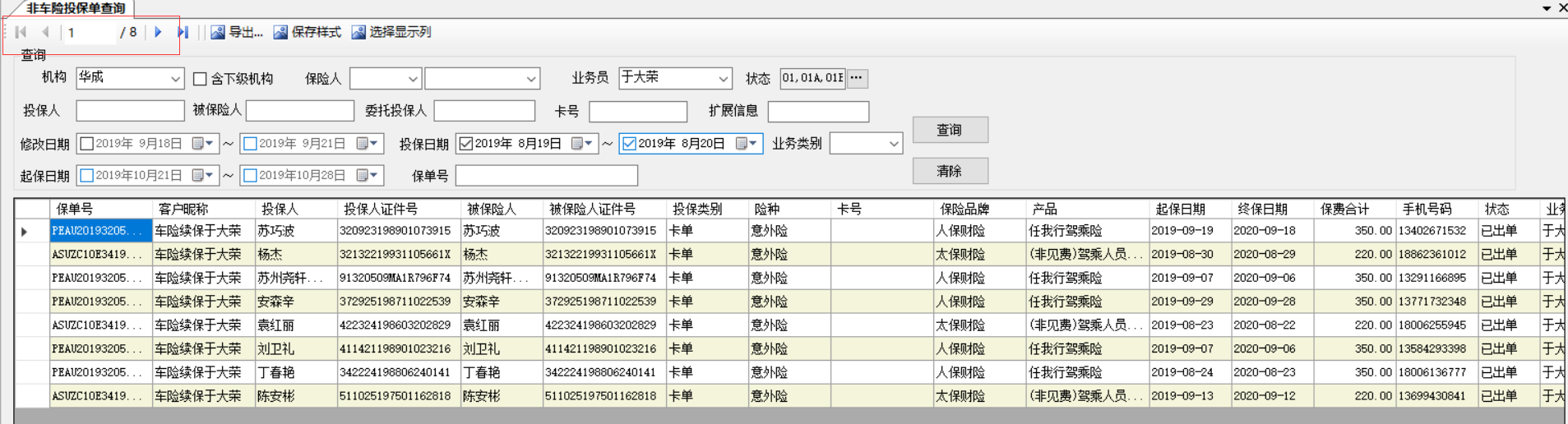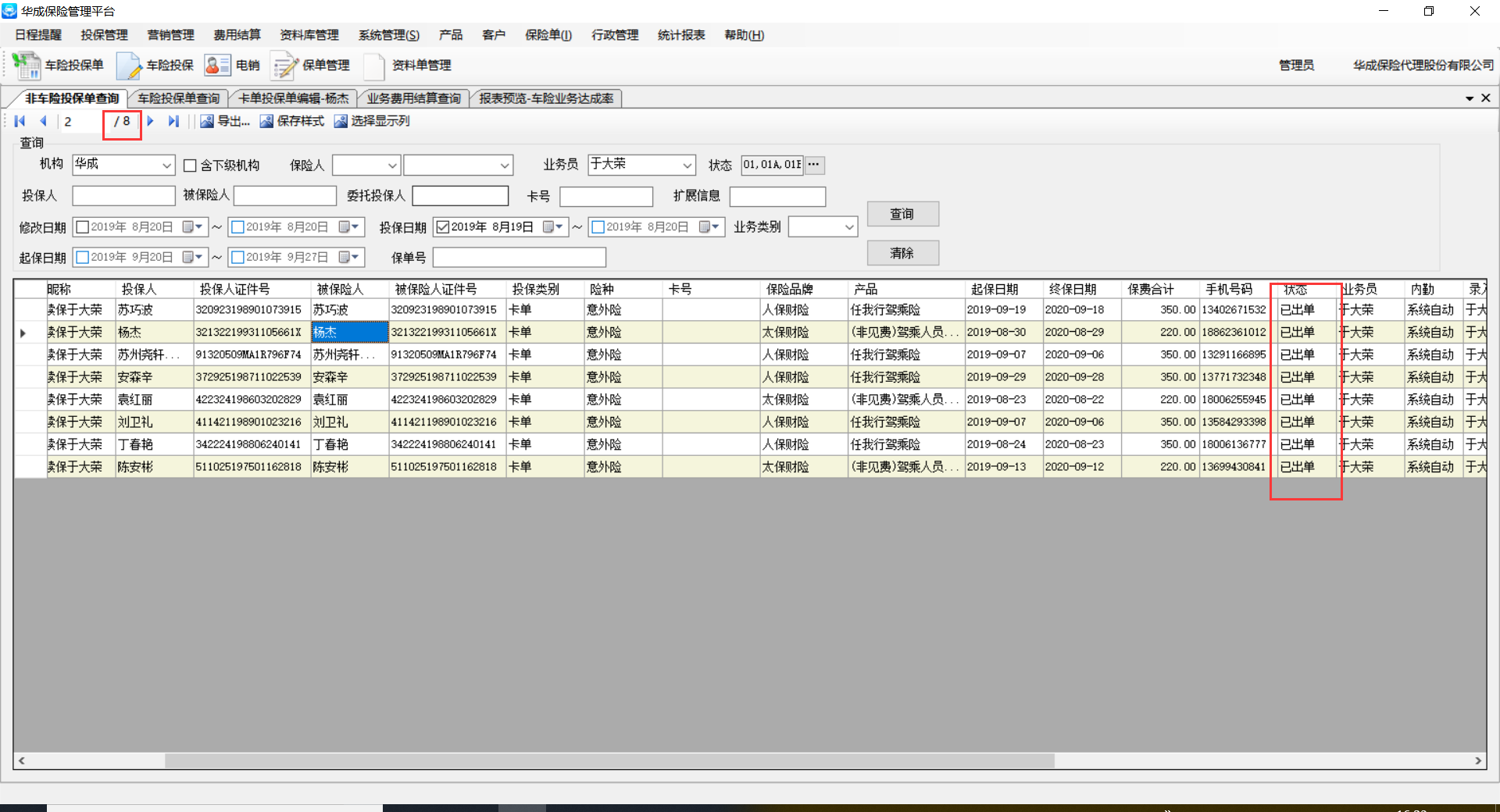 提出人:廖静州投保人:杨杰描述:在报表中显示非车险的出单数为6单,在非车险投保单中查询共有8单,请开发排查是什么原因导致有两单数据未能统计到报表中。