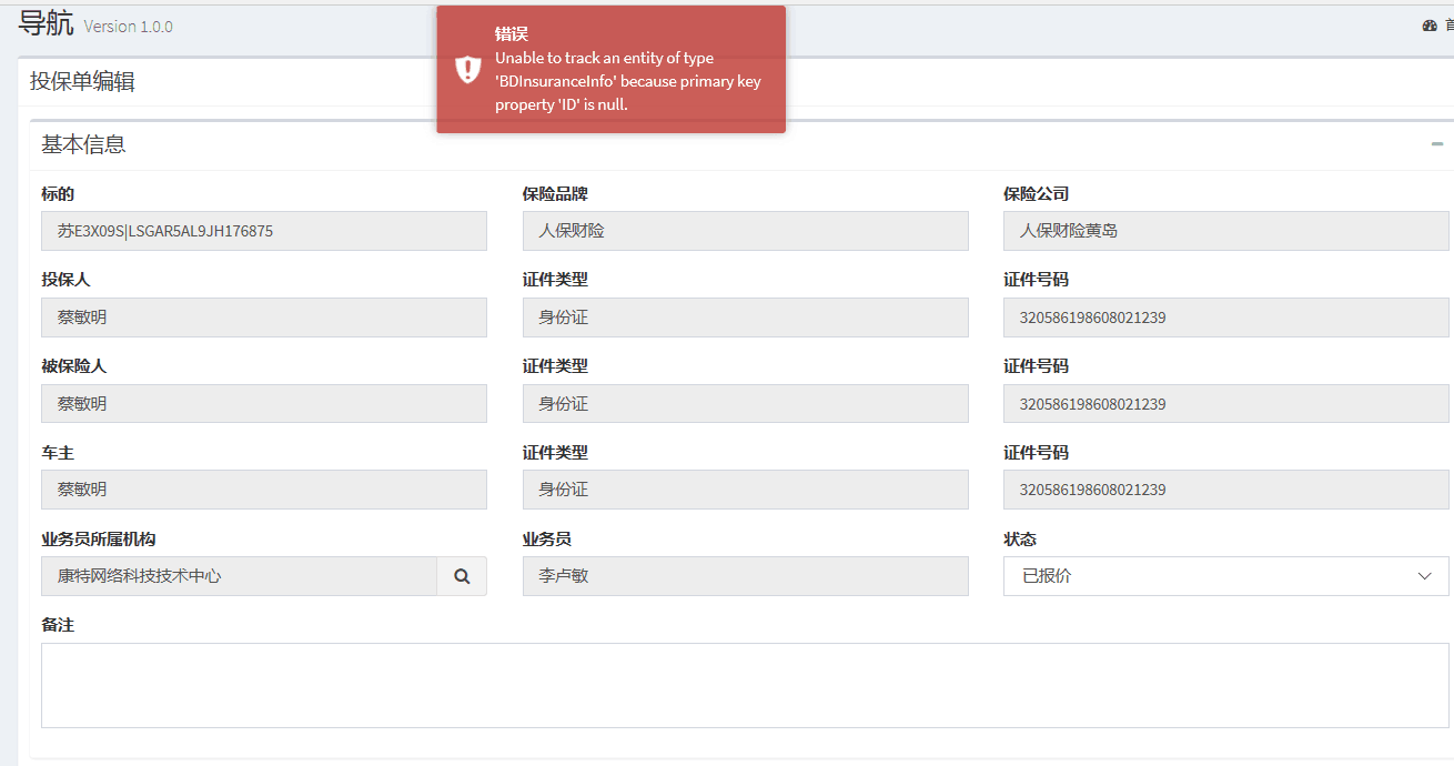 填写完保险信息,从待报价提交至已报价保存时提示错误