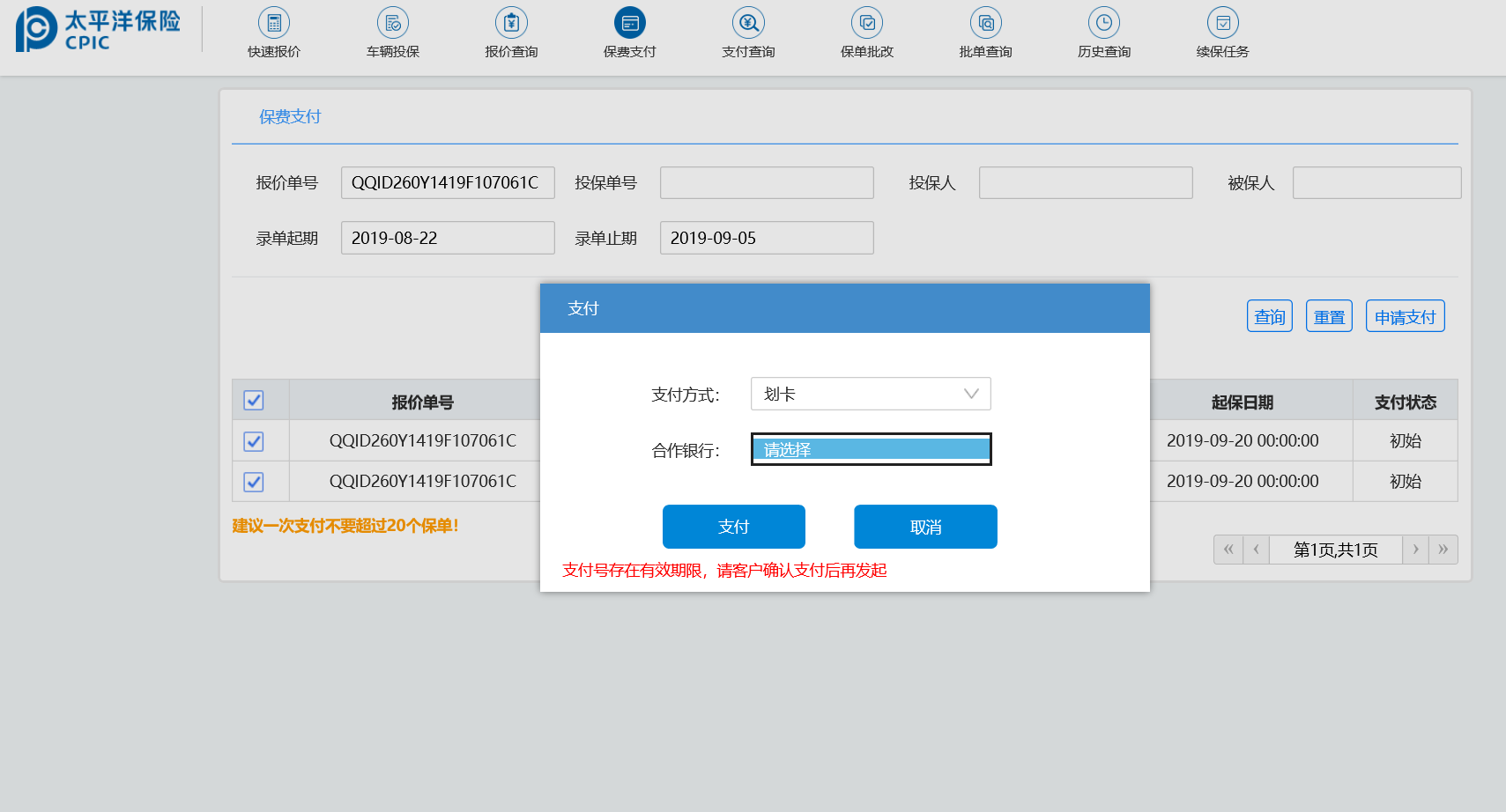 1、从管理系统添加投保单,点去报价-在保险公司报价成功-核保通过-申请支付-支付方式选择划卡