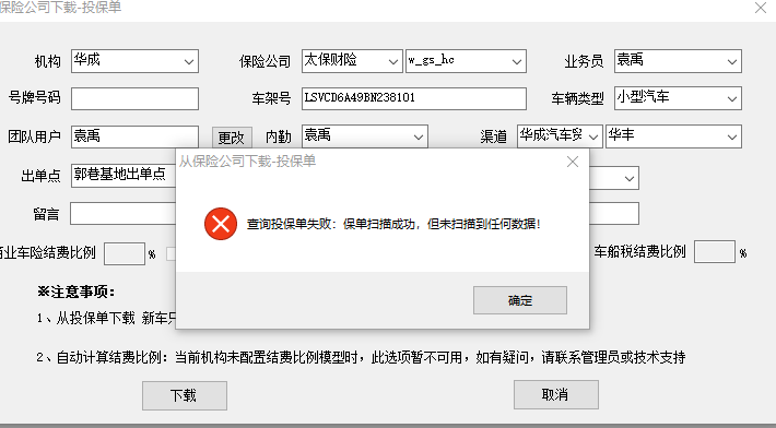 保险公司系统中可以查到相应投保单信息,但是下载投保单时则提示扫描成功,未找到保单详情。详情提示见附件