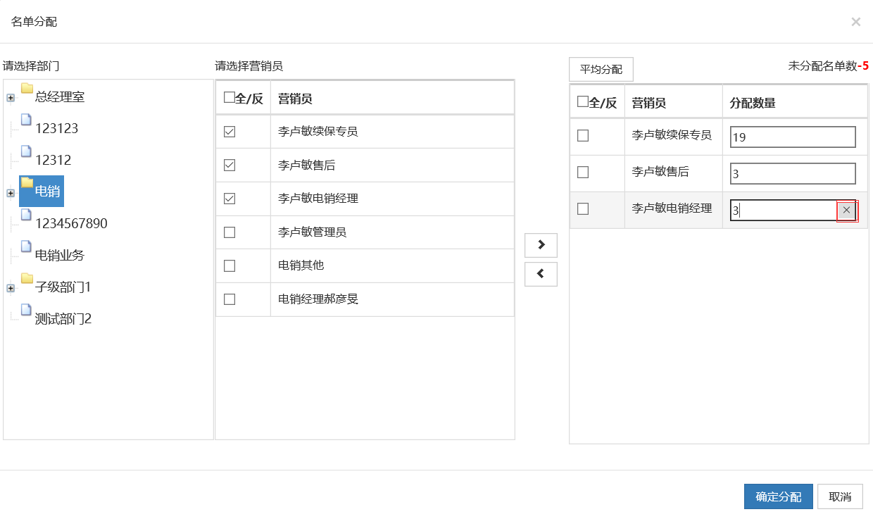 名单分配,输入分配数量-剩余分配数量为负数时,点击×号删除输入数量,未分配数量未自动更新。