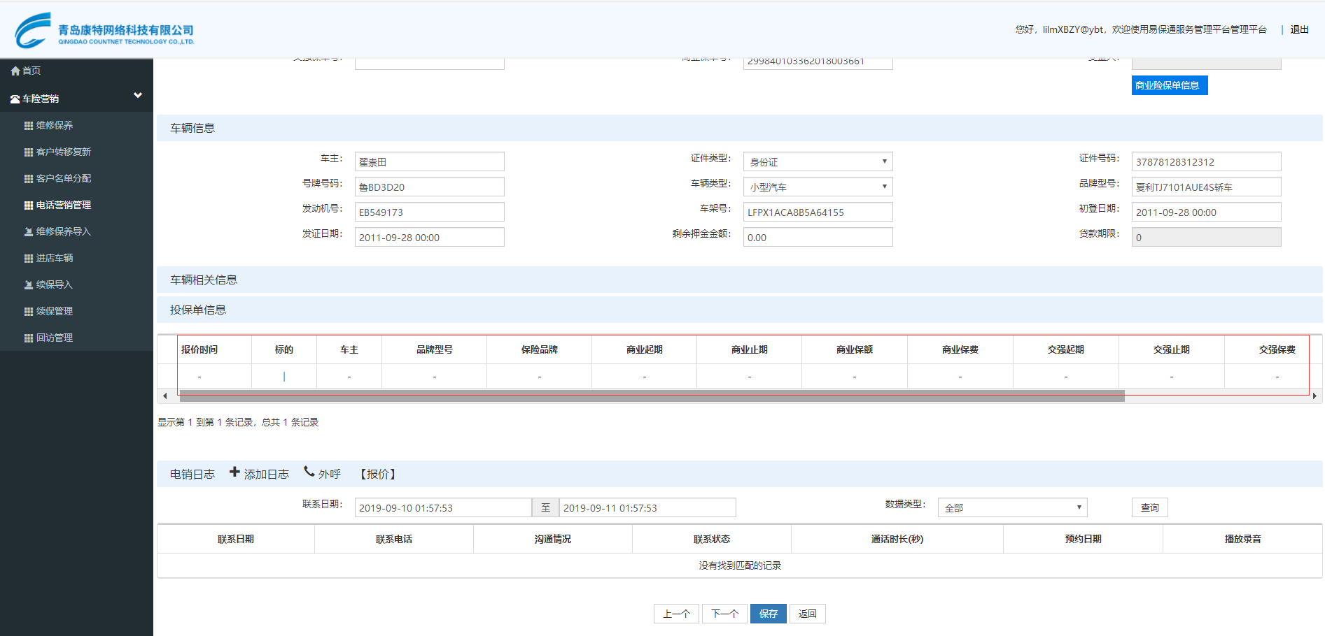 【电销管理】电销客户管理编辑界面,查看投保单信息,无信息显示