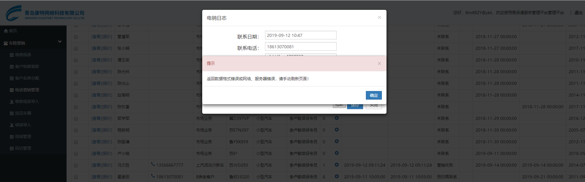 电销管理界面拨打电话,添加日志后点击保存,提示错误