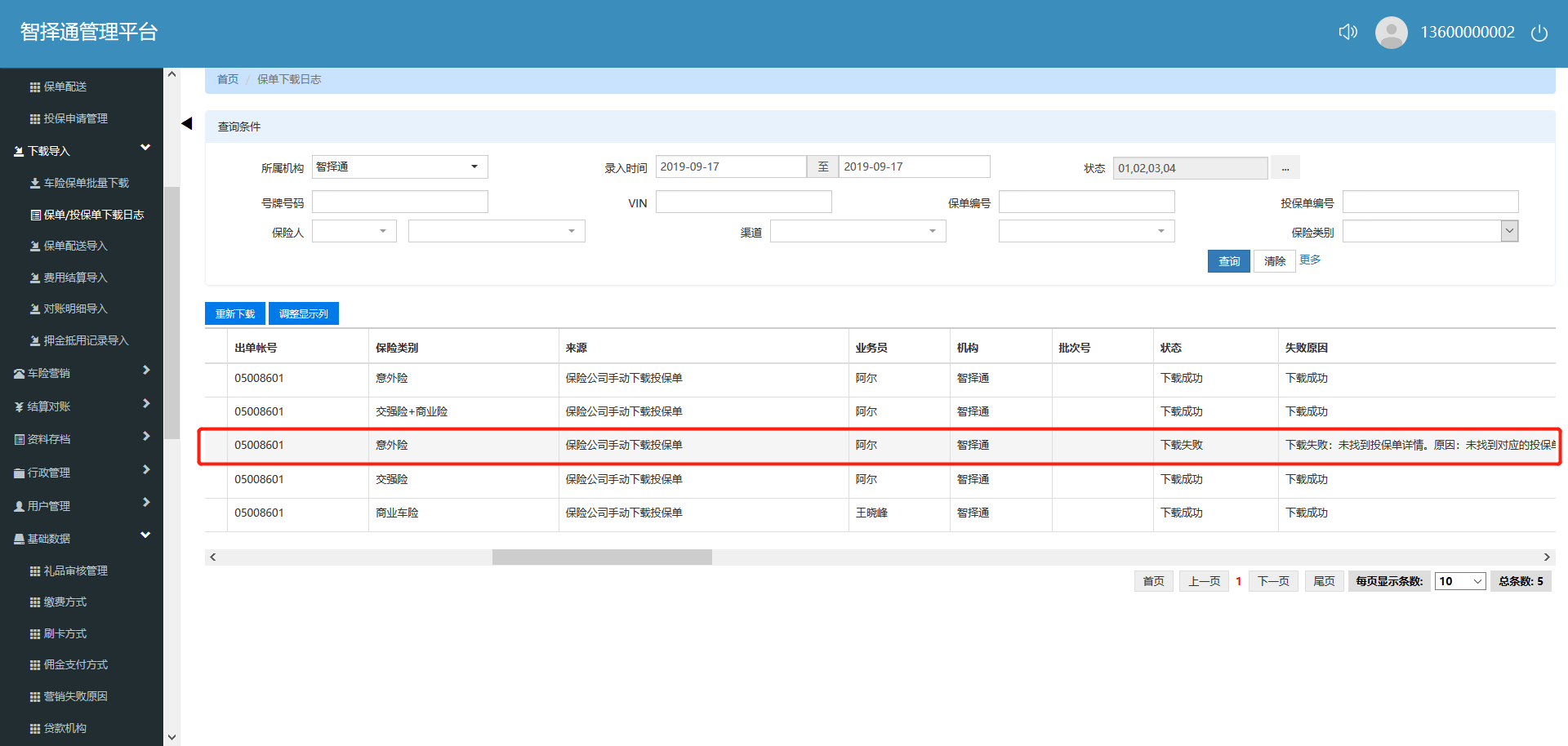 【出单中心2.0-人保电销】在电销系统选择非车险投保单下载,在管理系统中非车险投保单下载失败。