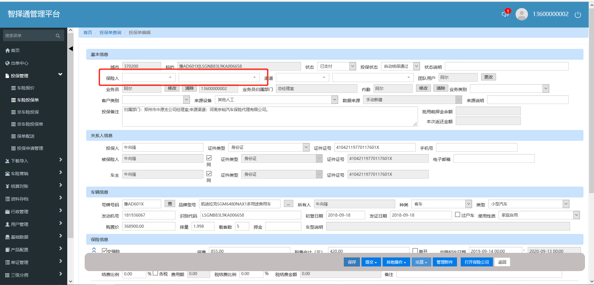 结果:车险投保单中保险人显示为空。