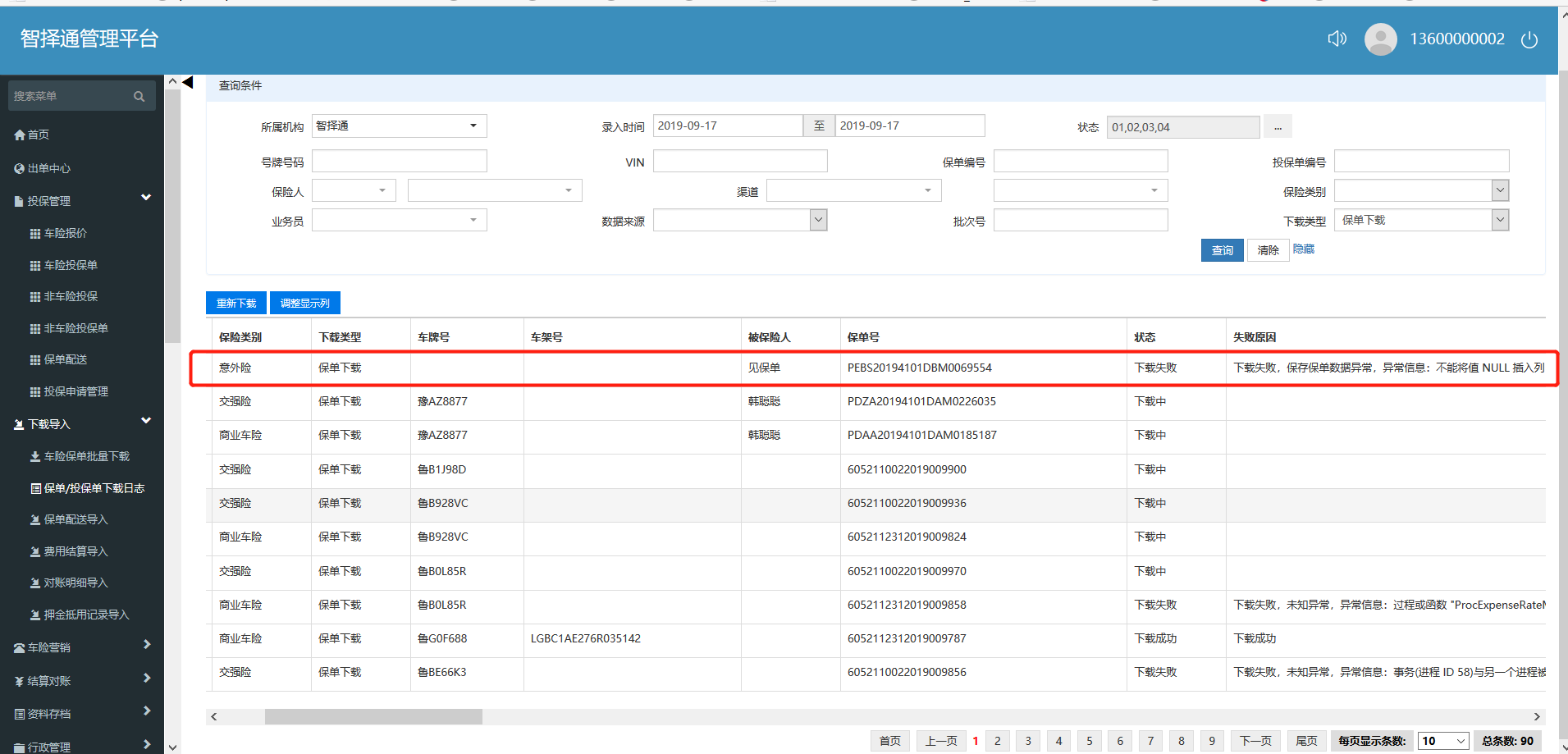 结果:非车险保单下载失败:‘下载失败,保存保单数据异常,异常信息:不能将值 NULL 插入列 "ApplicationID",表 "CountInsuranceTest.dbo.BOIQApplicationInsuredDetails";列不允许有 Null 值。UPDATE 失败。 语句已终止。’。