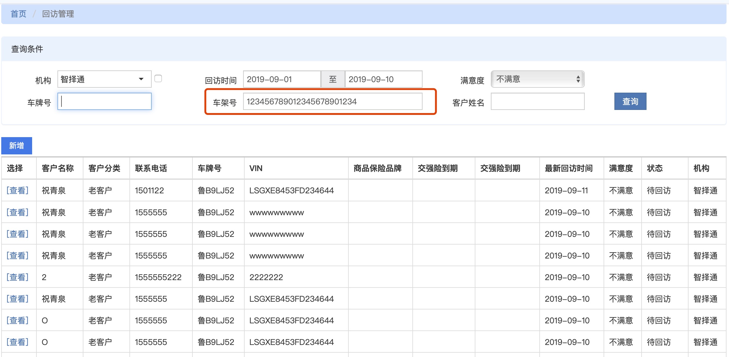 【电销管理】回访管理,查询时车架号应该限制最大输入20位