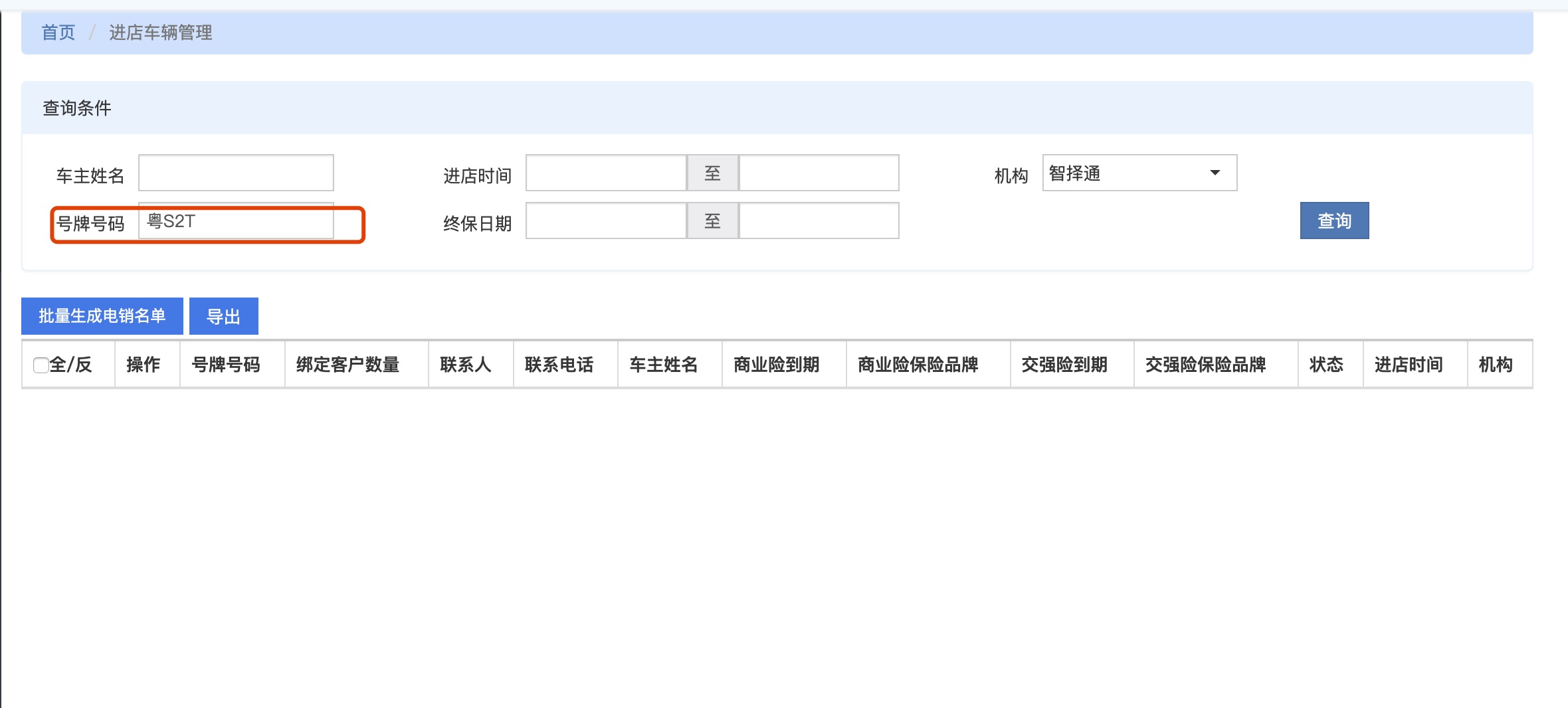 【电销管理】进店车辆,查询时车牌号输入不完整,无法模糊查询数据