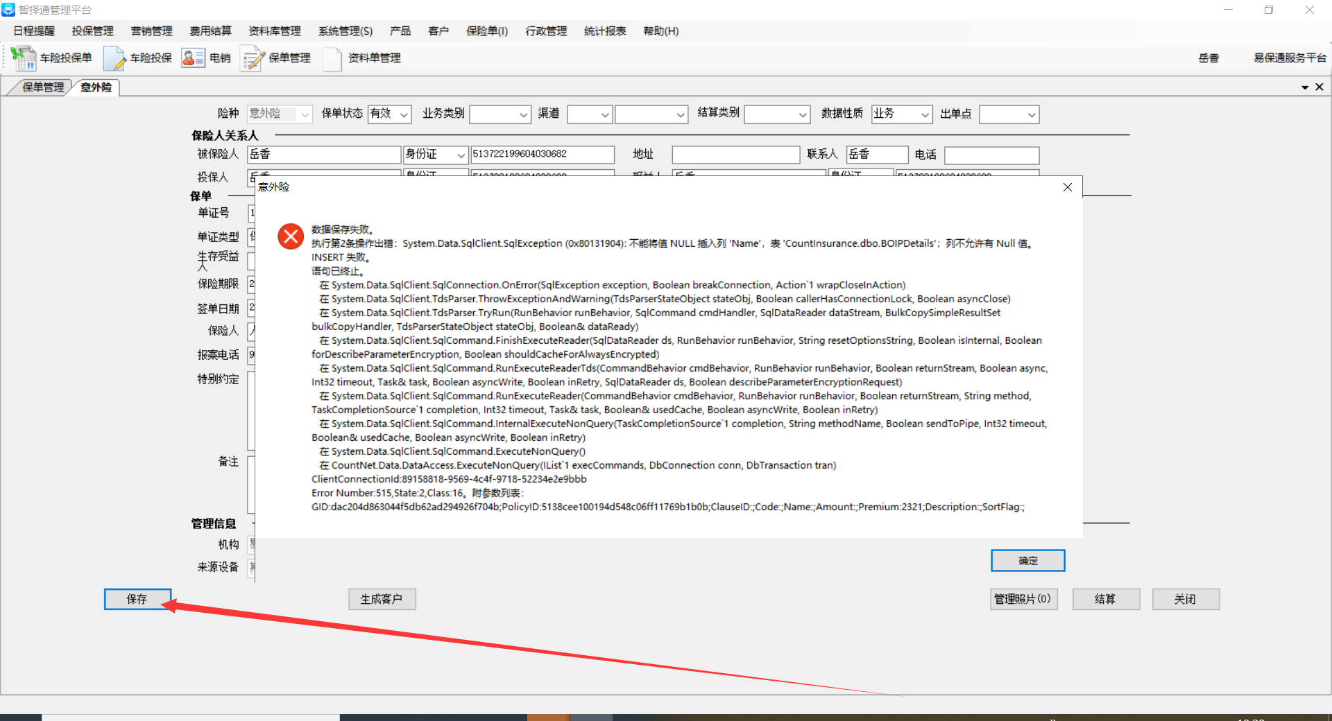 2、投保明细内出现个别字段未填写时点击保存,系统提示报错。