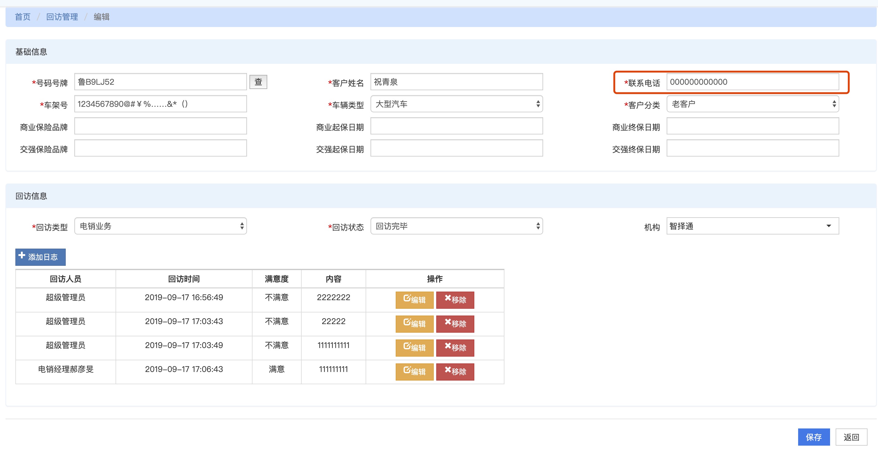 【电销管理】回访管理,新增/编辑数据时,联系电话未做基本格式正则,未必全部覆盖,但一些基本的错误格式还是要正则出来,比如手机号不可以输入11个0