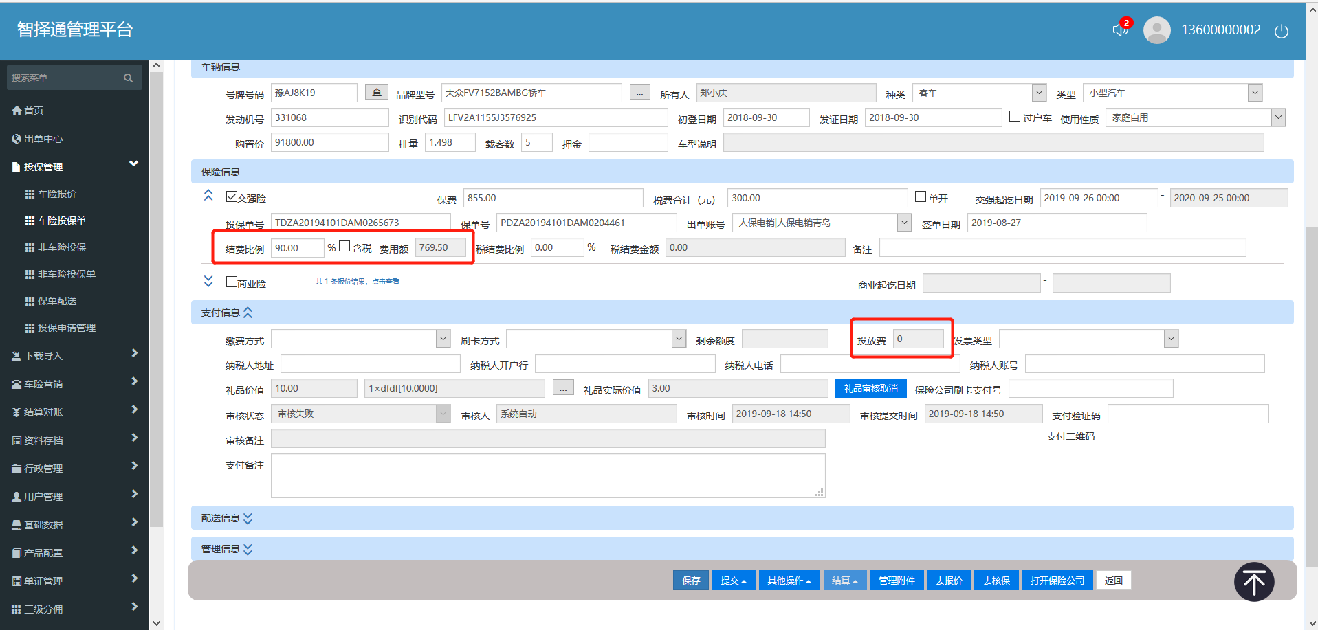 结果:投保单的支付信息中投放费显示为0,交强险中的费用额显示正常。