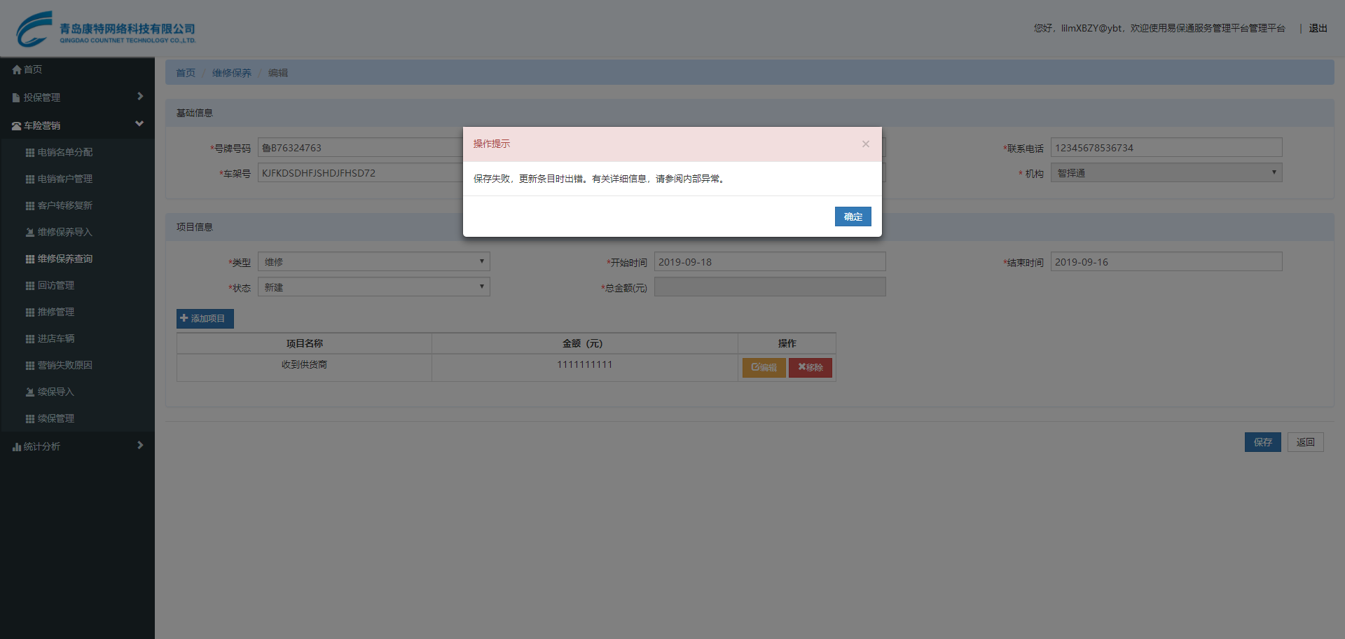 维修保养信息新增界面,所有输入框输入最大值(项目金额输入10),点击保存报错