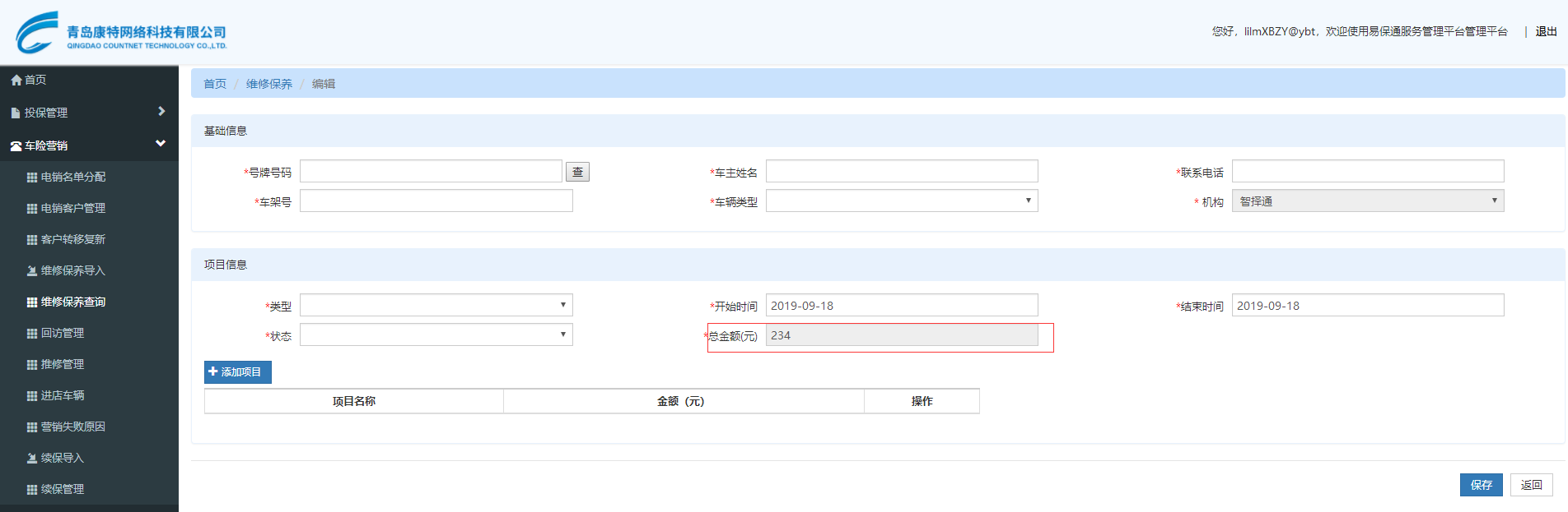 【电销管理】维修保养新增界面,输入项目金额后,总金额更新,移除该金额后,总金额未变化