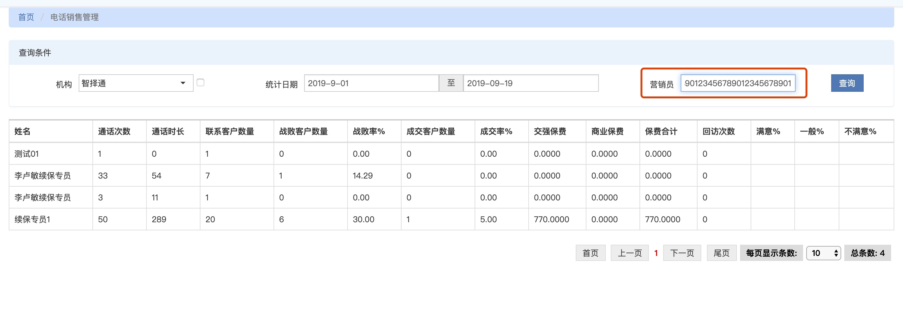 【电销管理】电销统计按用户,查询页面营销员未做最大长度限制,50位