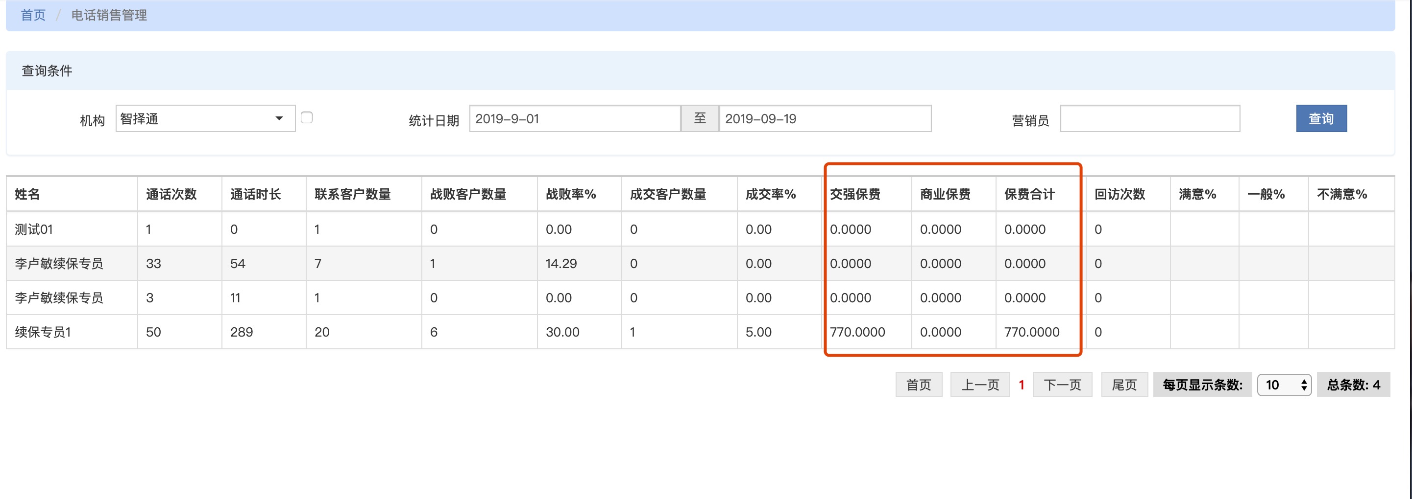 【电销管理】电销统计按用户,页面列显示,交强保费、商业保费、保费合计,建议小数点后两位