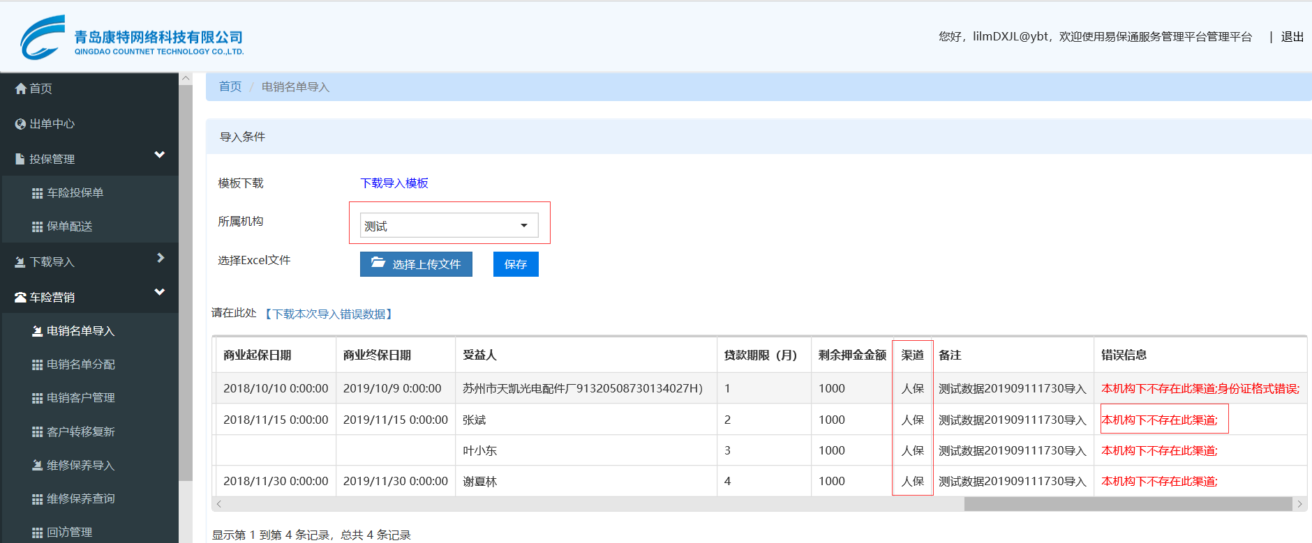 登录电销经理账号,电销名单导入,选择别的机构,机构下存在该渠道,导入时渠道报错