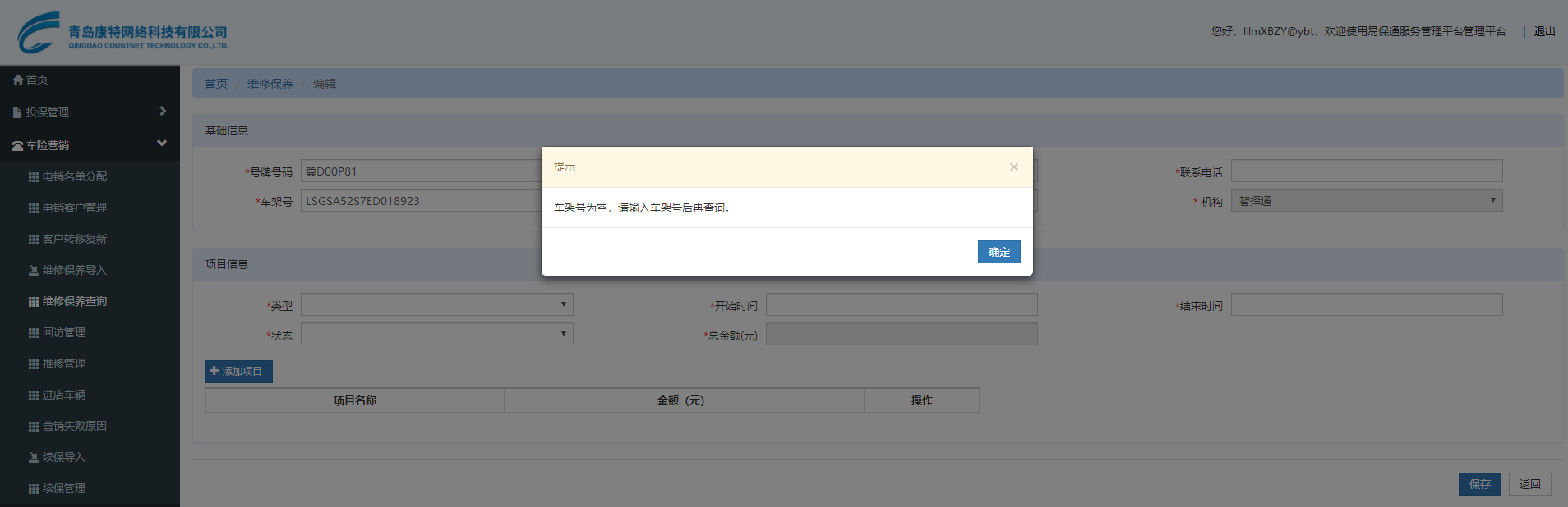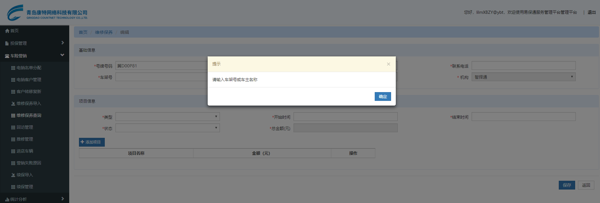 【电销管理】维修保养查询,新增-输入号牌号码点击查,弹窗提示输入车主姓名或车架号,输入车主姓名后点击查,提示车架号为空,提示错误。