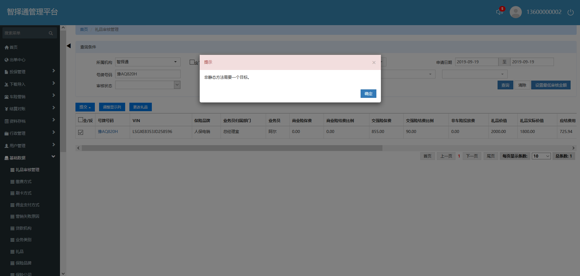 【出单中心2.0-人保电销】在礼品审核管理中更改礼品后点确定提示‘非静态方法需要一个目标。’