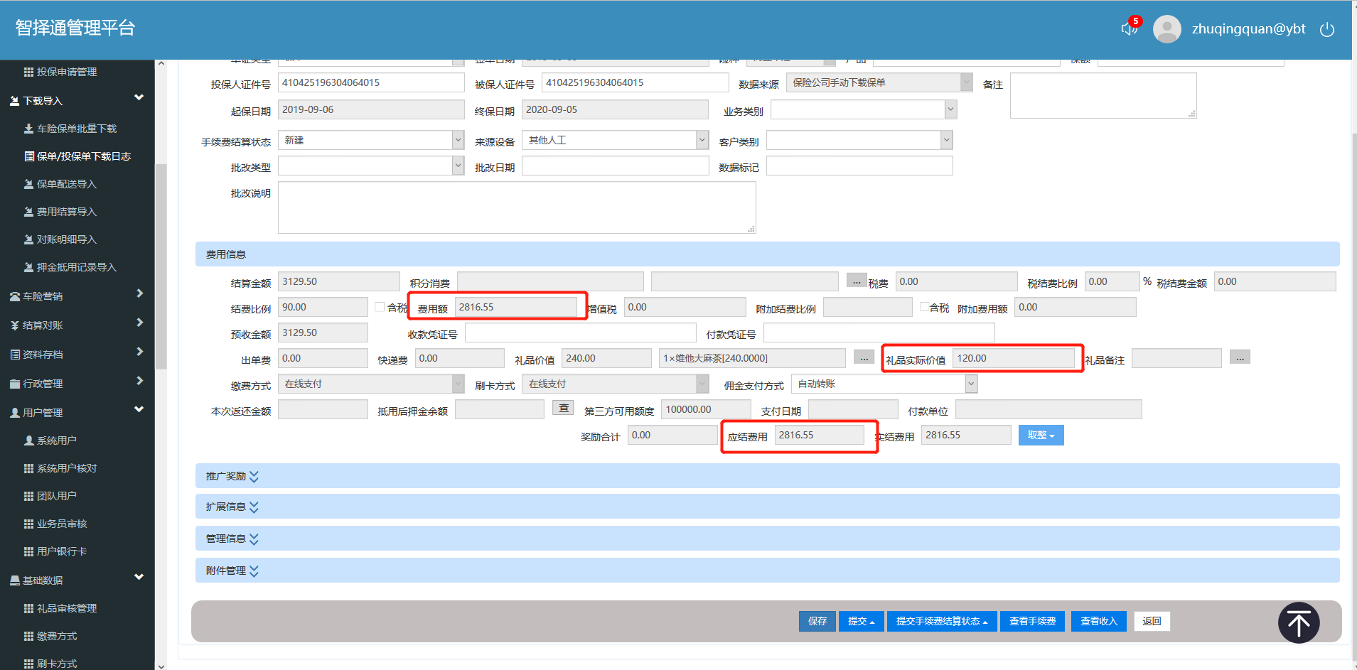 从电销系统便捷下载保单,生成结算单,结算单中应结费用=费用额,费用额没有减去礼品价值