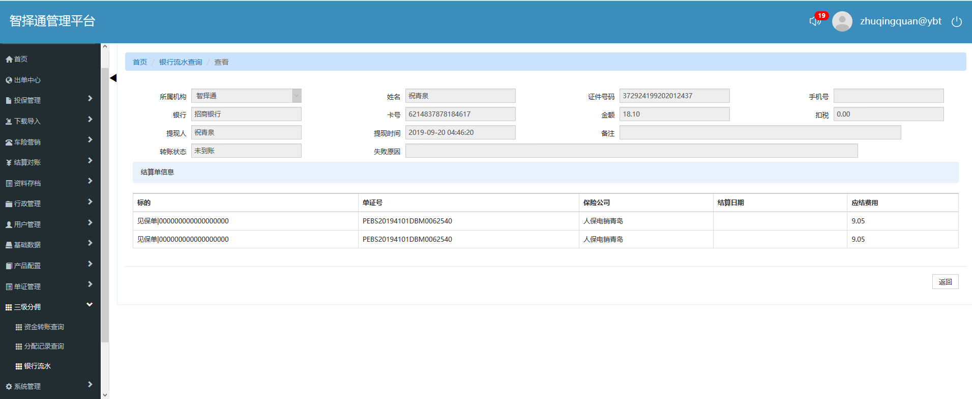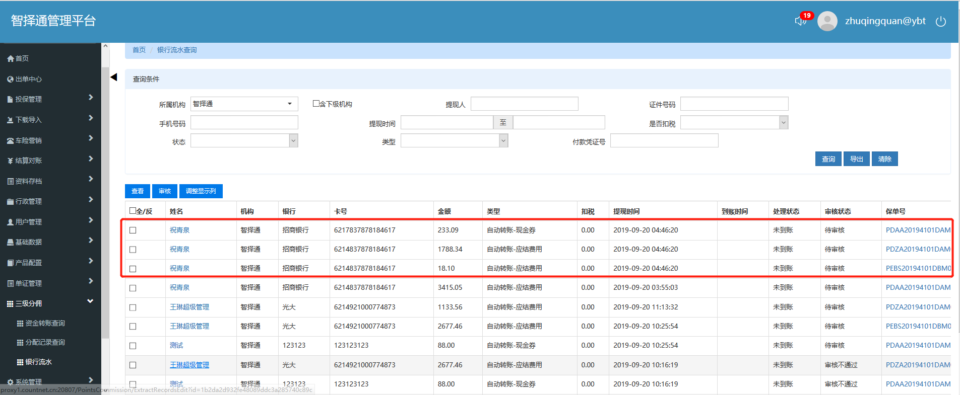 【出单中心2.0-人保电销】批量提交结算单至自动付款(包括非车险),银行流水会生成三条数据。