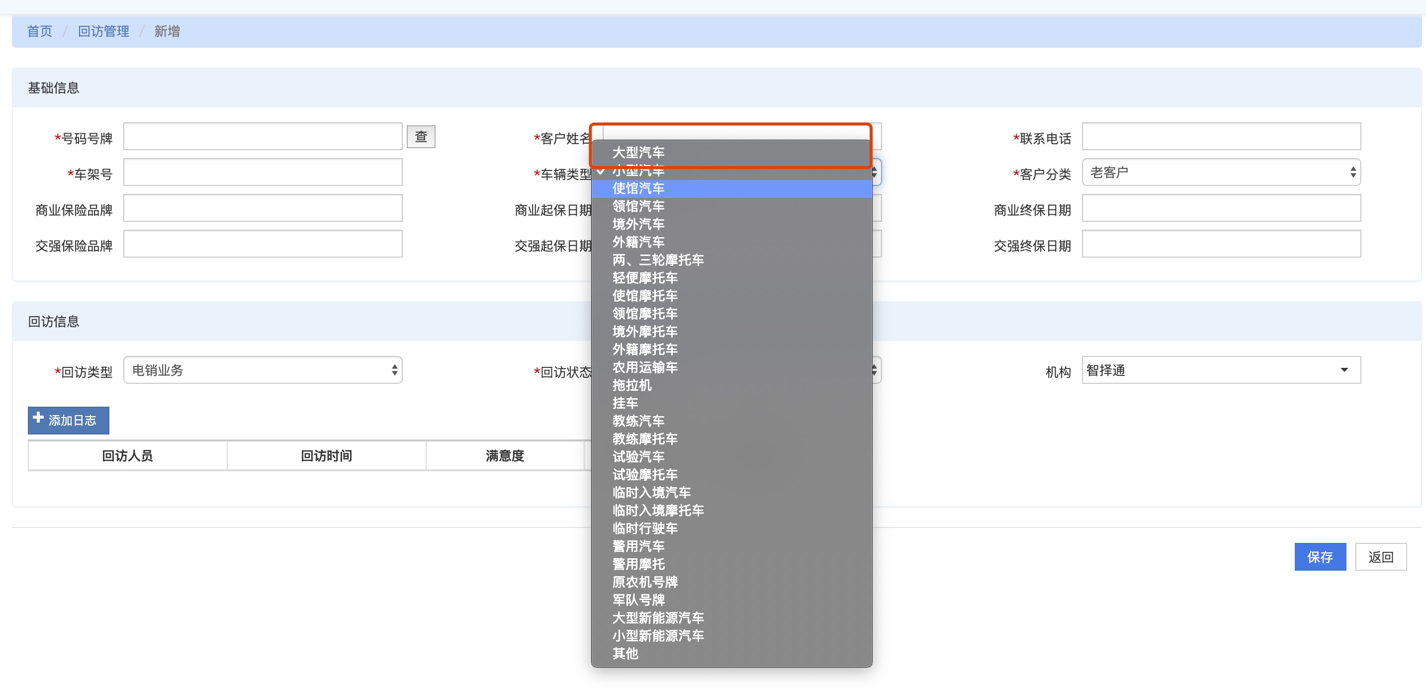 【电销管理】回访管理,新增/编辑数据时,车辆类型、客户分类添加空选项