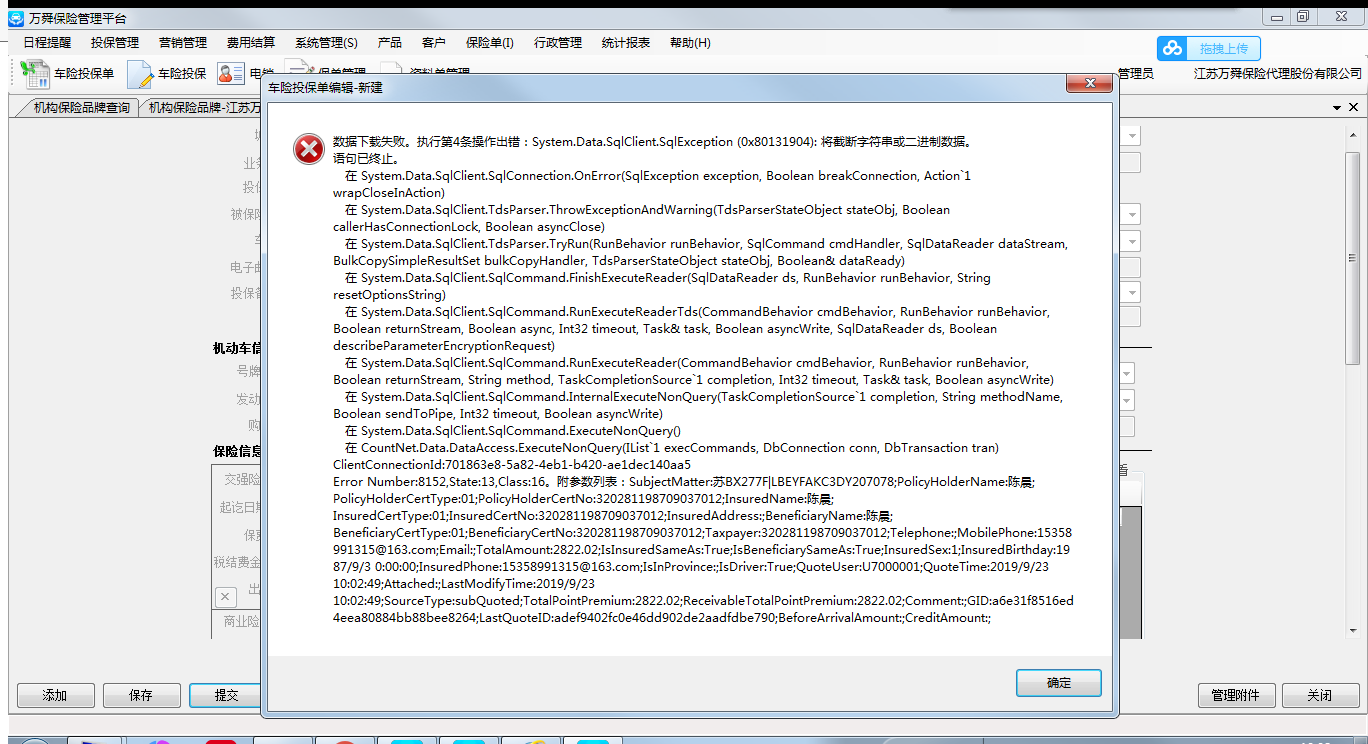 【江苏万舜】太保老系统,提交到已报价时提示将截断字符串或二进制数据。