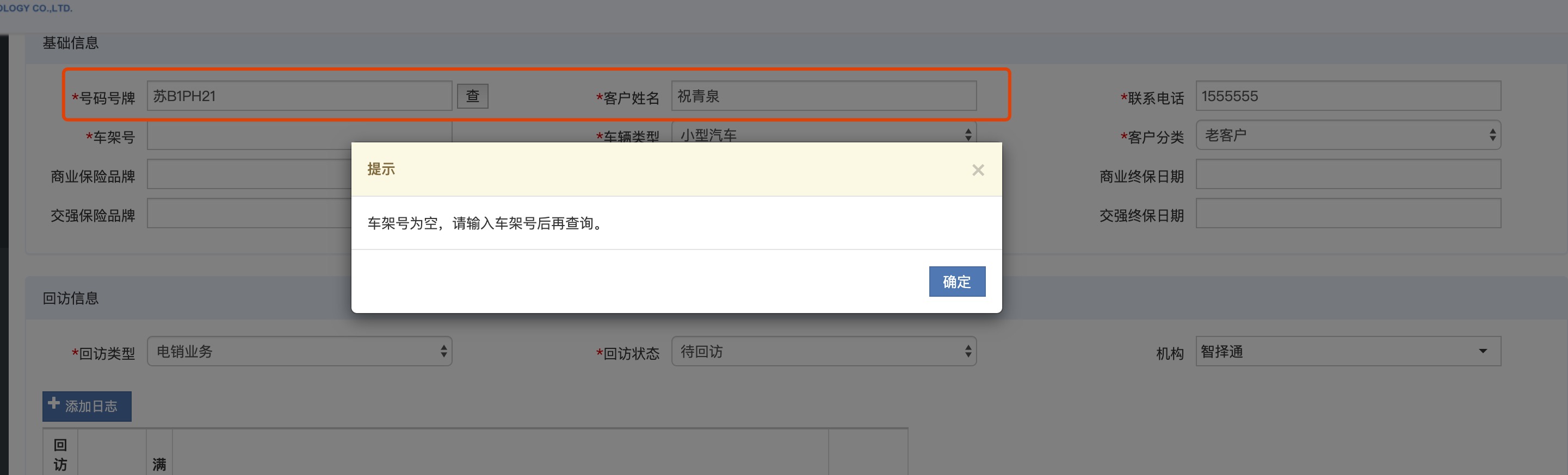 【电销管理】回访管理,查询时输入号牌号码和车主姓名,点击“查”,提示需要输入车架号,需求中车牌号和车主姓名组合,也可以查询数据